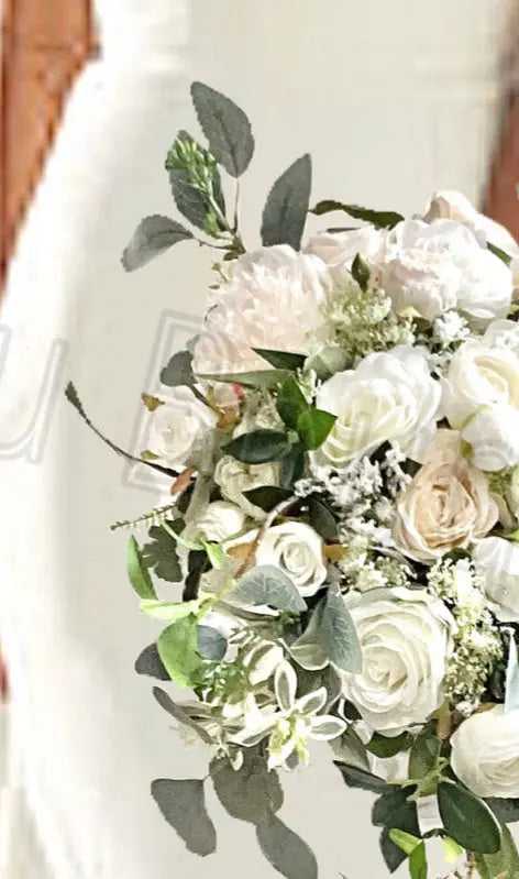 Artificial Roses & Peonies - Cream, Ivory Teardrop Bridal Bouquet Wedding Flowers