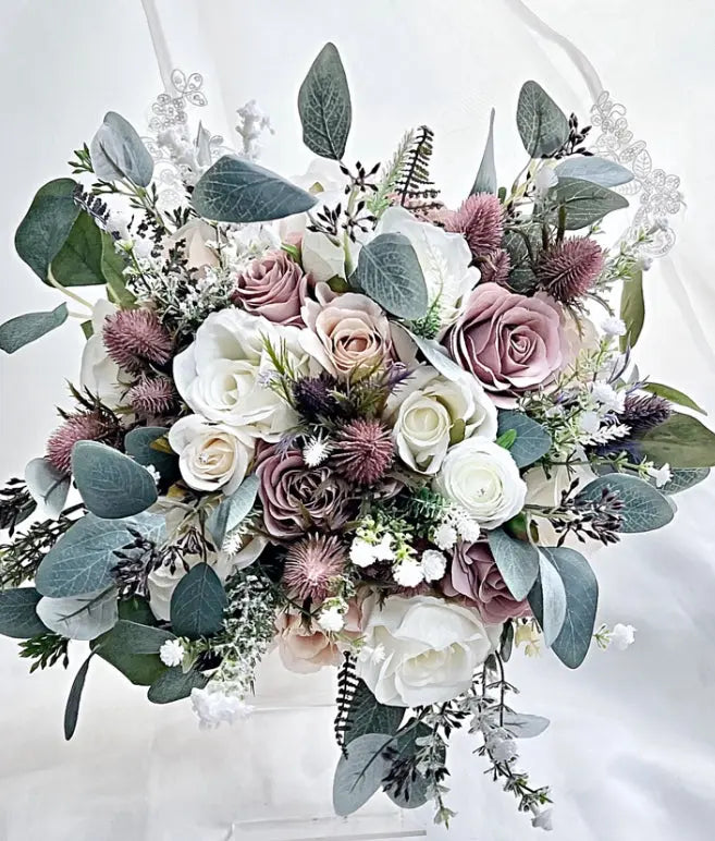 The round loose design with mauve thistles and roses is sure to make your special day even more memorable.