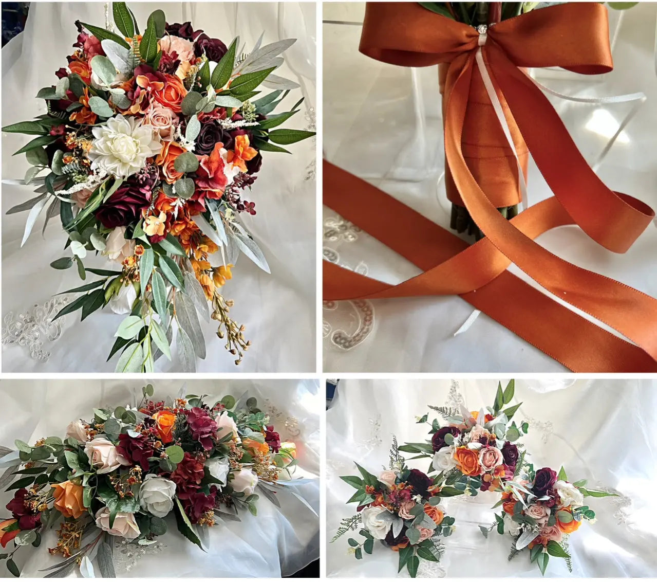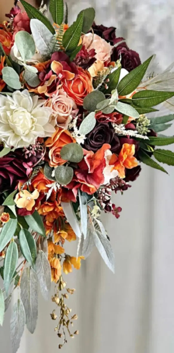 The bouquet features artificial burgundy and orange roses, perfect for adding a touch of rustic / Autumn to your special day.