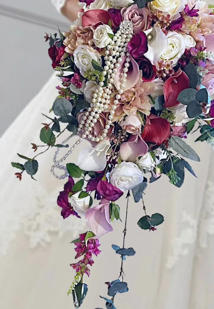 Bridal Cascade Bouquet, Artificial Wedding Flowers in cerise ,blush pink, ivory