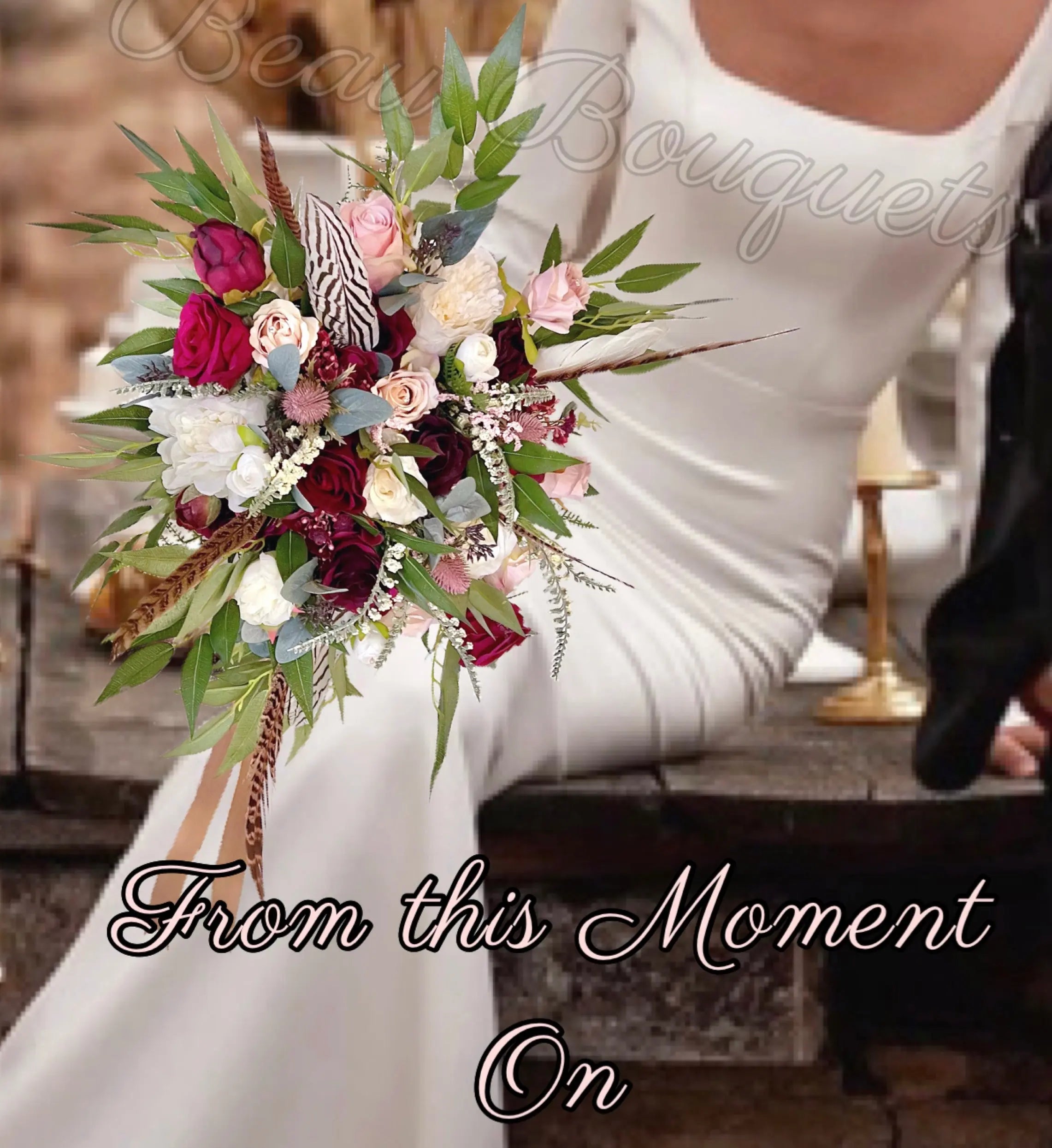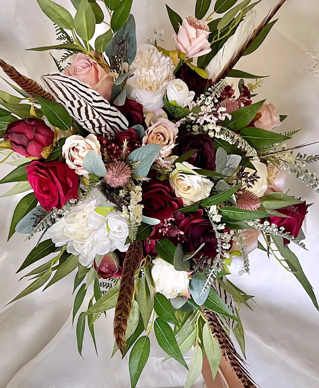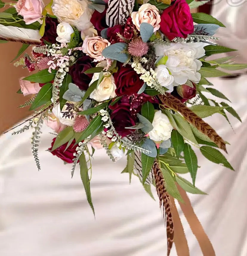 The bouquet features artificial burgundy, ivory and pink roses, perfect for adding a touch of rich jewel tones to your special day.