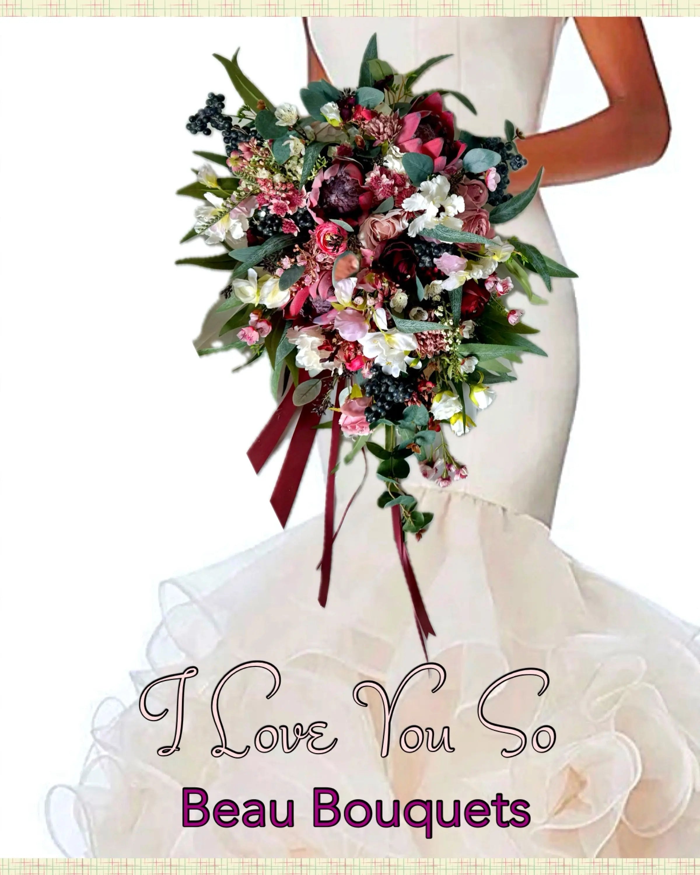 1 x Large Bridal Cascading Bouquet (approximately 20” drop; smaller sizes can be customized to meet your needs)