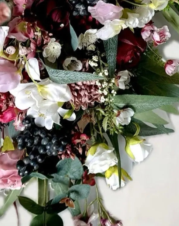 This beautiful arrangement features artificial burgundy and red roses, hawthorn berries designed to enhance the elegance of your special day.