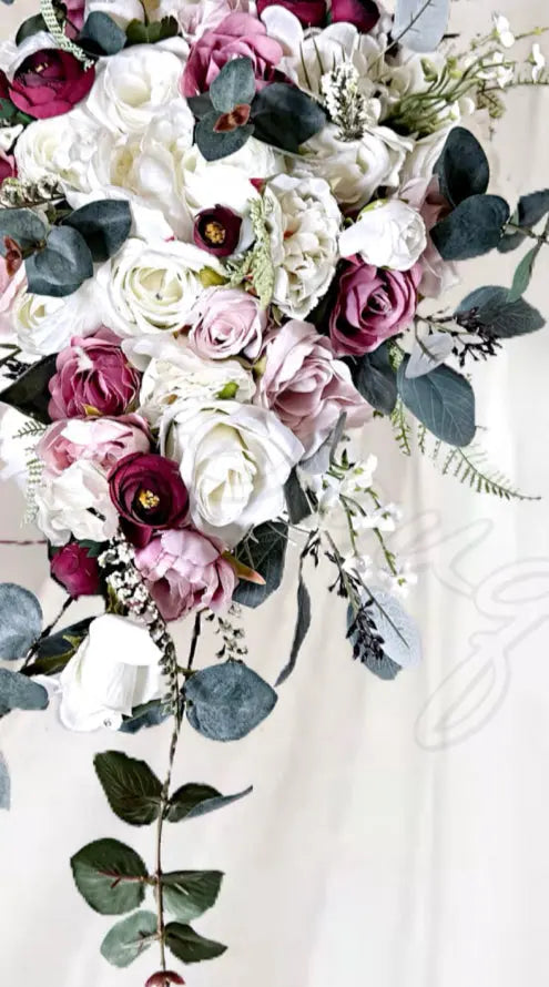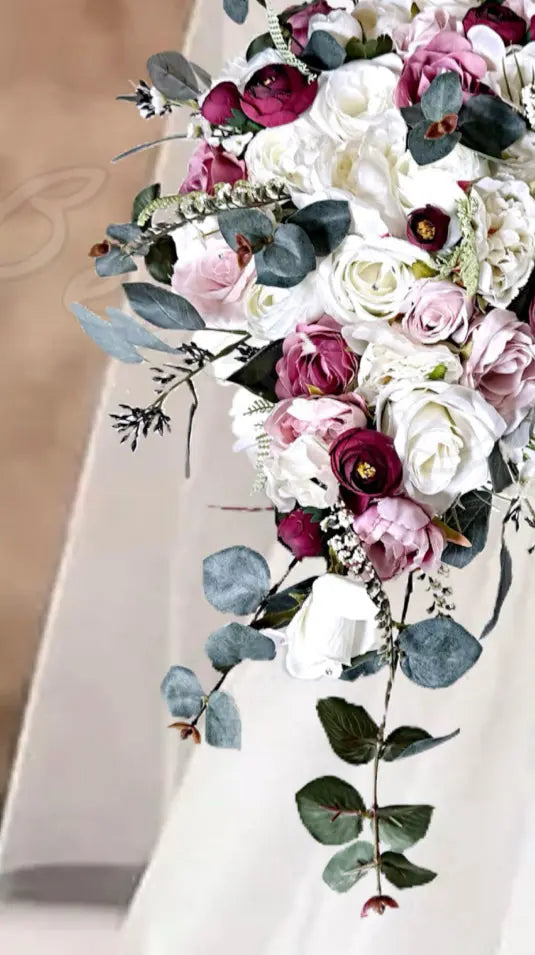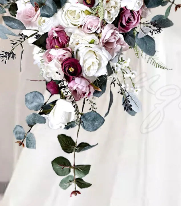 Cascading silk rose Bridal Bouquet, Artificial Flowers in Burgundy, Blush, Ivory
