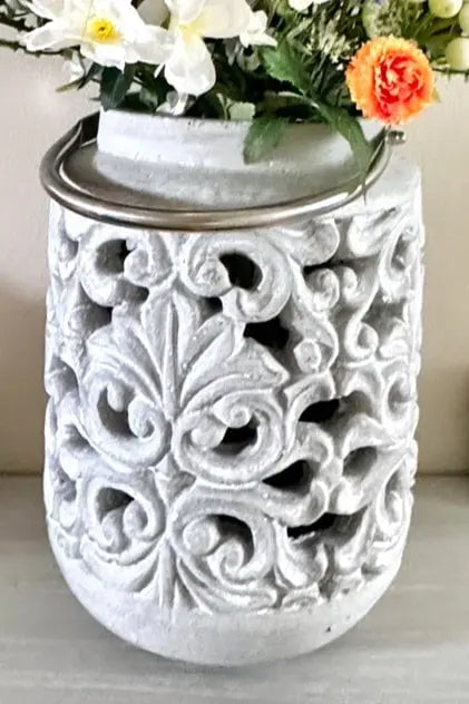 With its simple soft pale grey natural colour and decorative cut out detail it’s perfect for outdoors with candlelight or why not pop