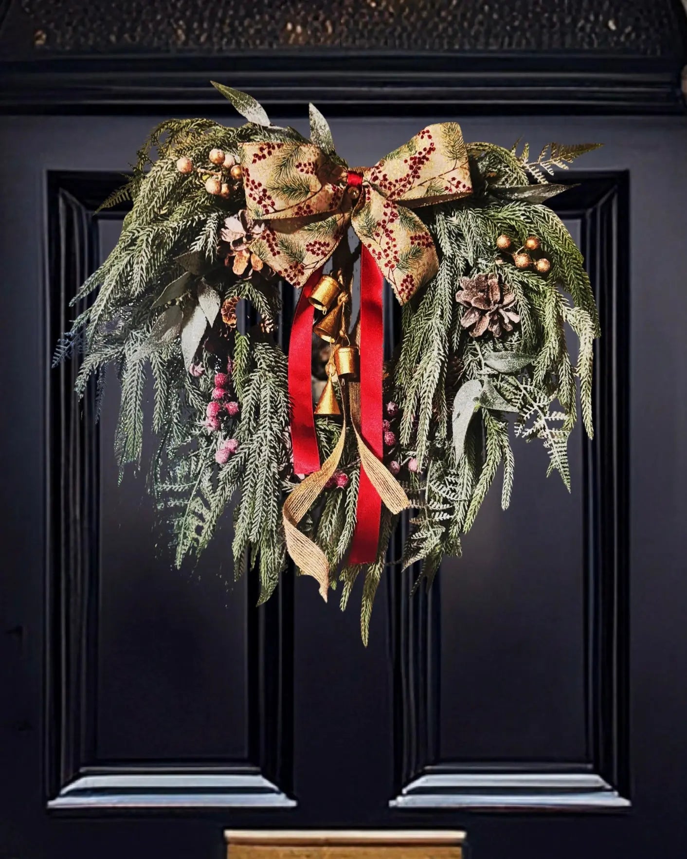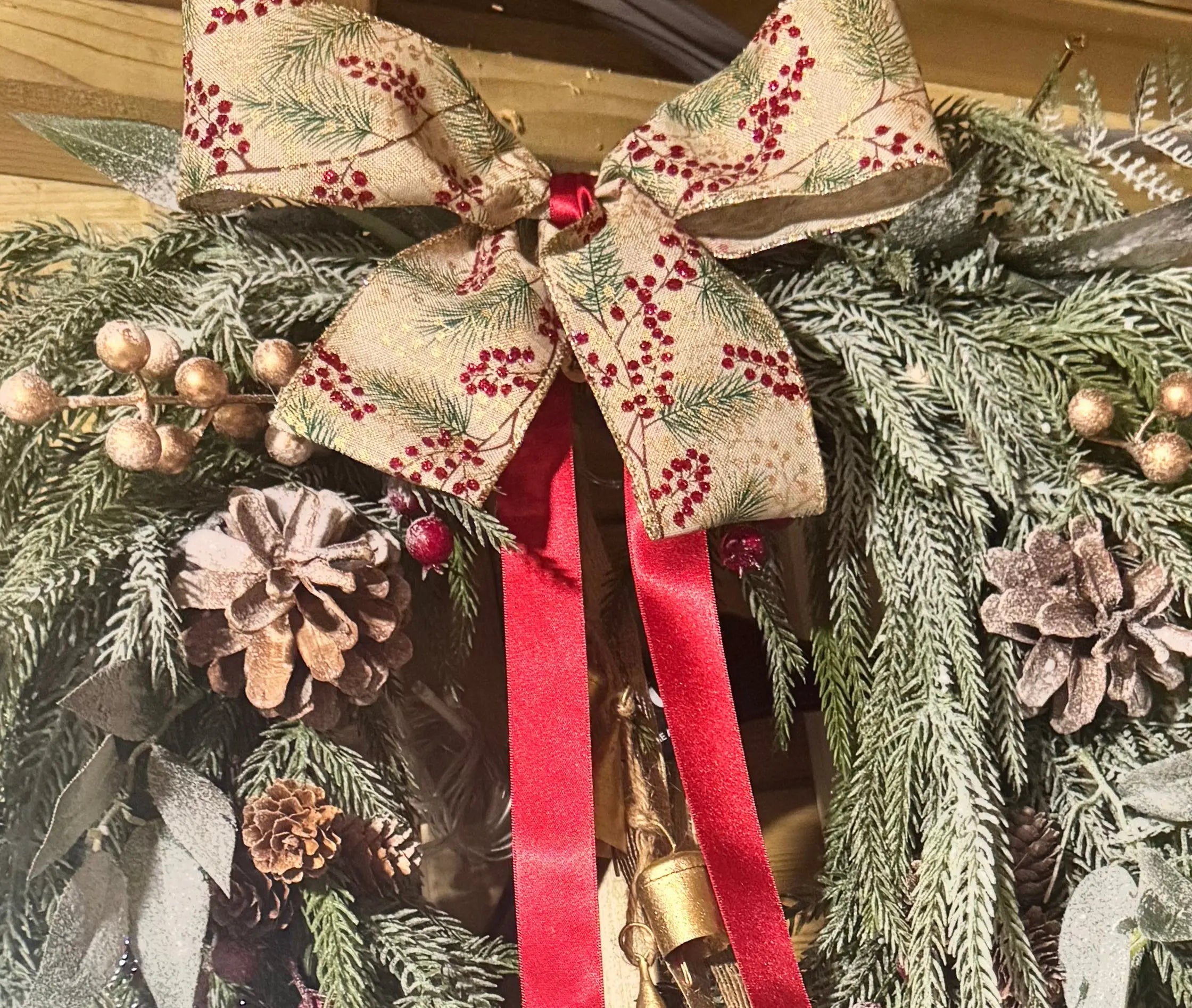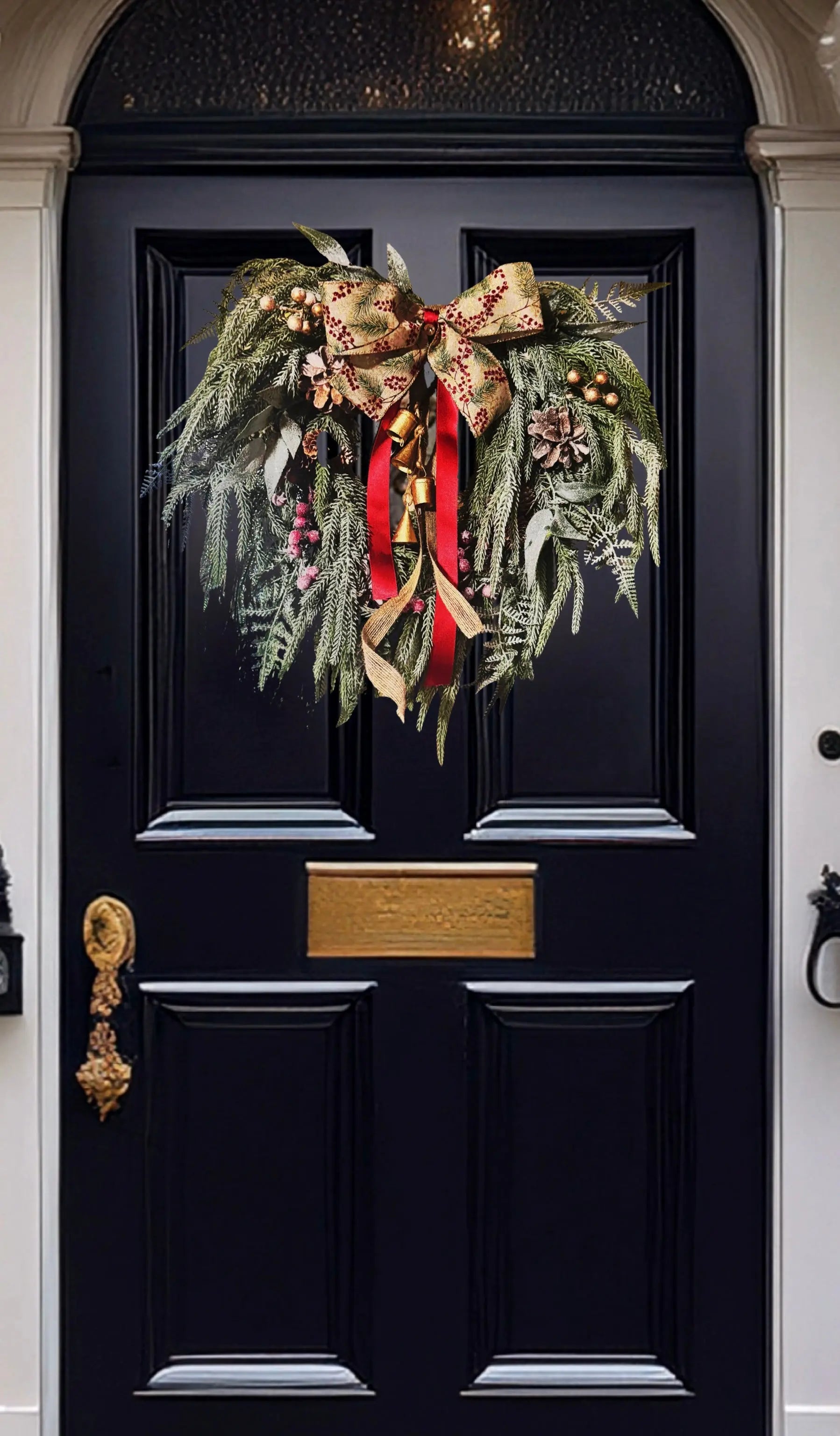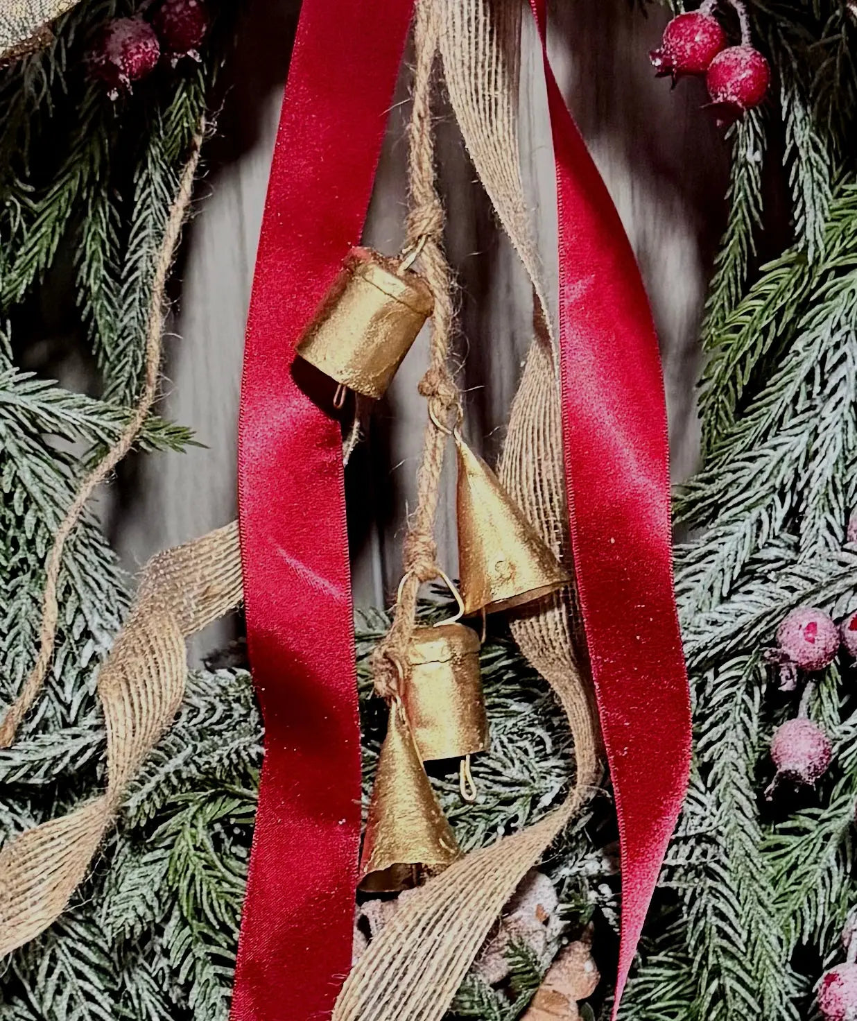 Make your feative time extra special with this beautiful door wreath . features luxury real feel nordic pine , laurel and cedar with red & gold berries, fir cones & wonderful metal gold bells that jingle finished with quality large Hessian bow with trailing satin red ribbons