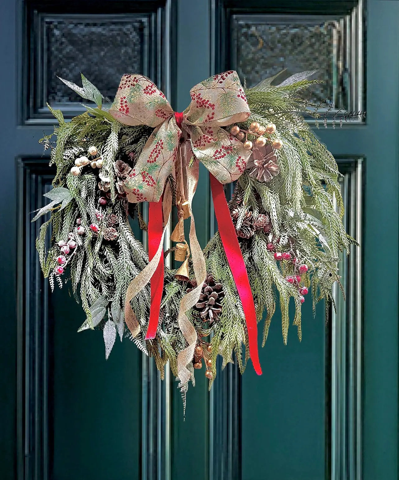 Make your feative time extra special with this beautiful door wreath . features luxury real feel nordic pine , laurel and cedar with red & gold berries, fir cones & wonderful metal gold bells that jingle finished with quality large Hessian bow with trailing satin red ribbons