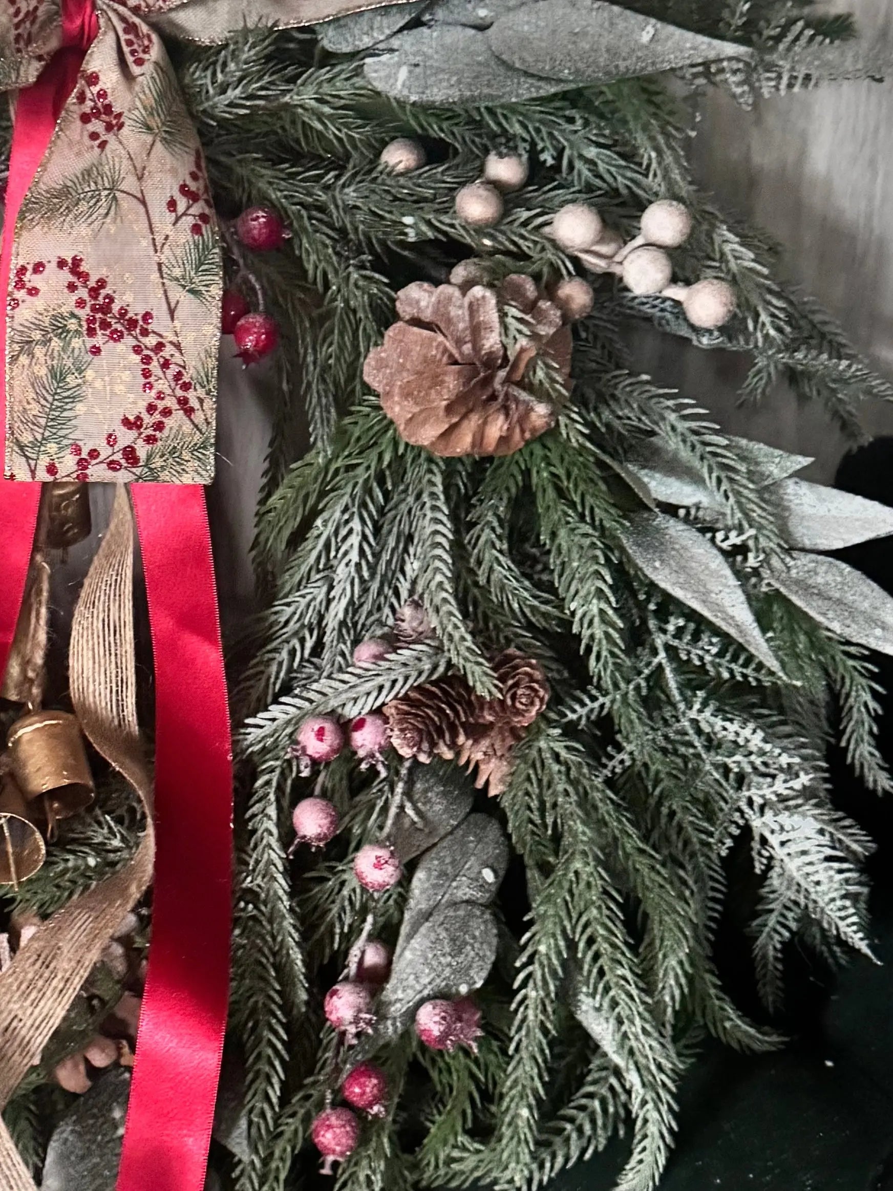 Christmas wreath, real touch snowy nordic pine, fir cones, berries, Bells