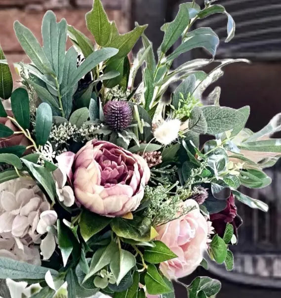 Beautiful Scottish thistle Large Artificial open spray with silk roses in white ivory, cream,  blush pink and burgundy.