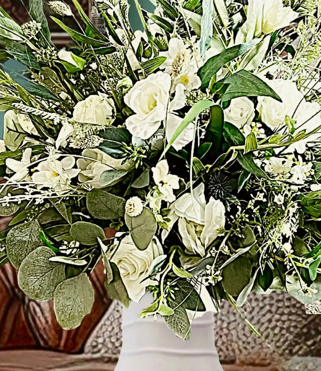 Created with eucalyptus, astrantia, ranunculus, fern, grasses, hydrangea detail for a beautiful display.