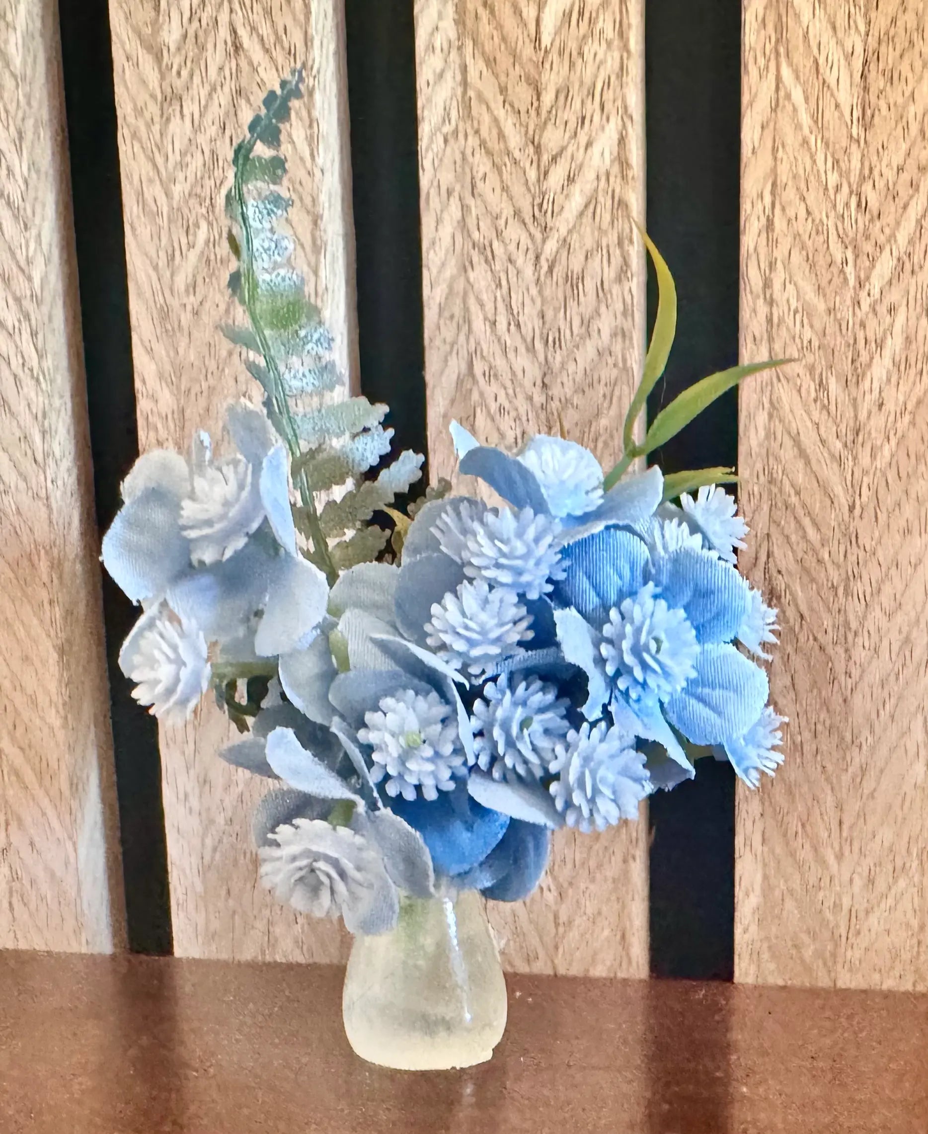 Colourful pale blue bouquet with foliage detail fridge magnet in mini frosted glass vase