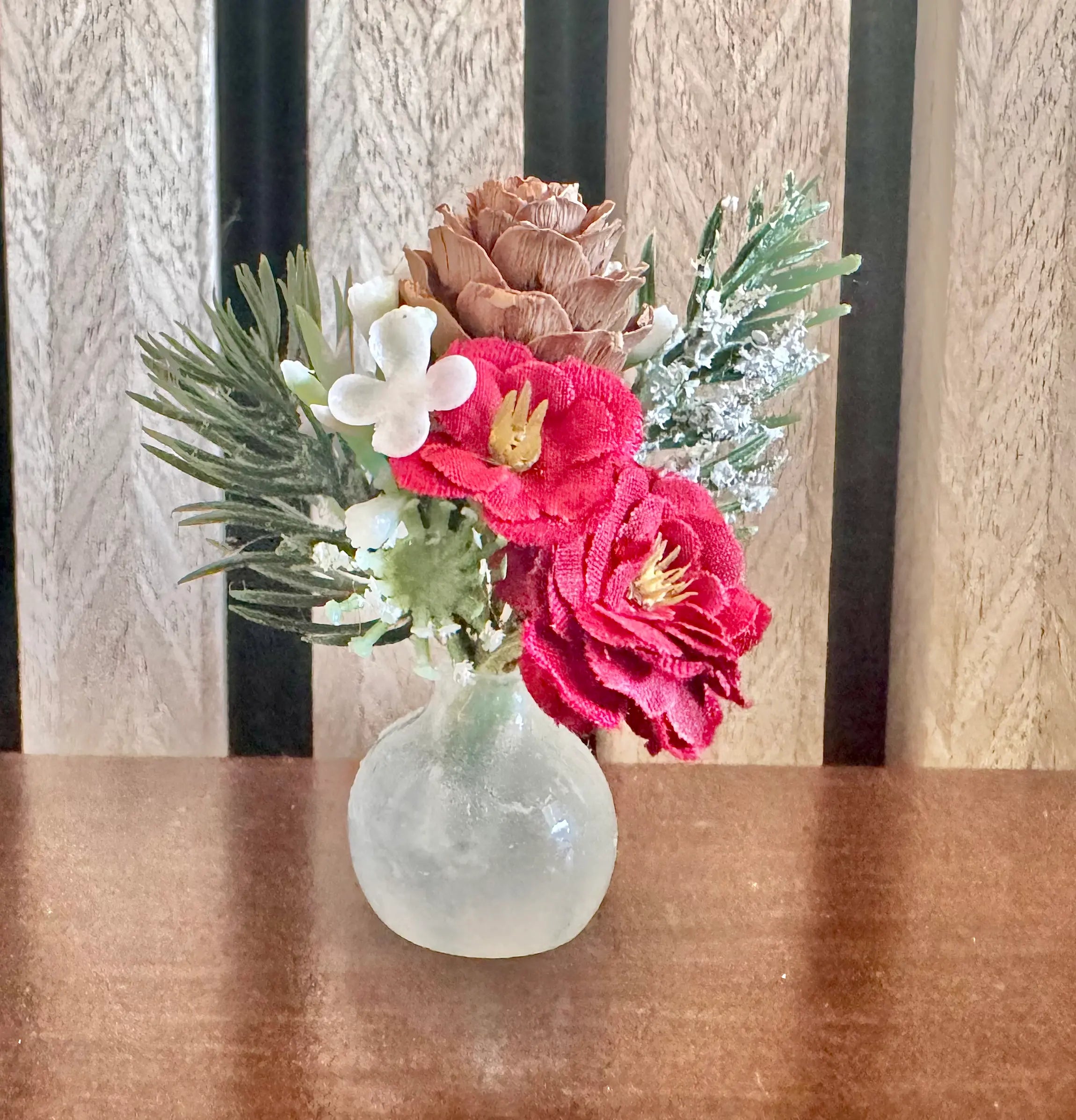 Colourful Christmas / winter spruce bouquet with mini rose & fir cone detail fridge magnet in mini frosted glass vase