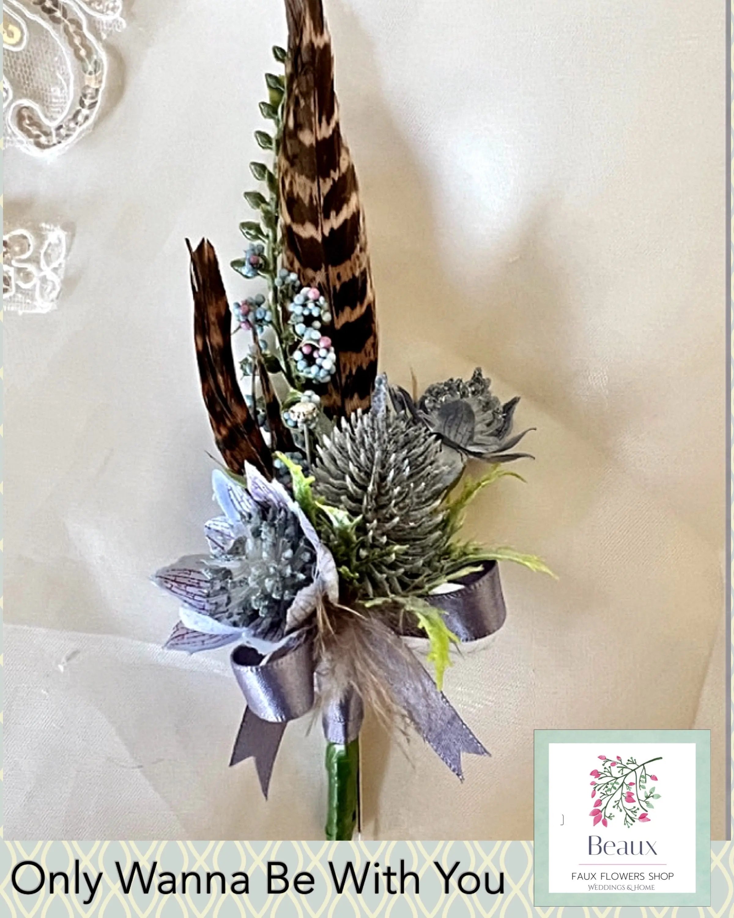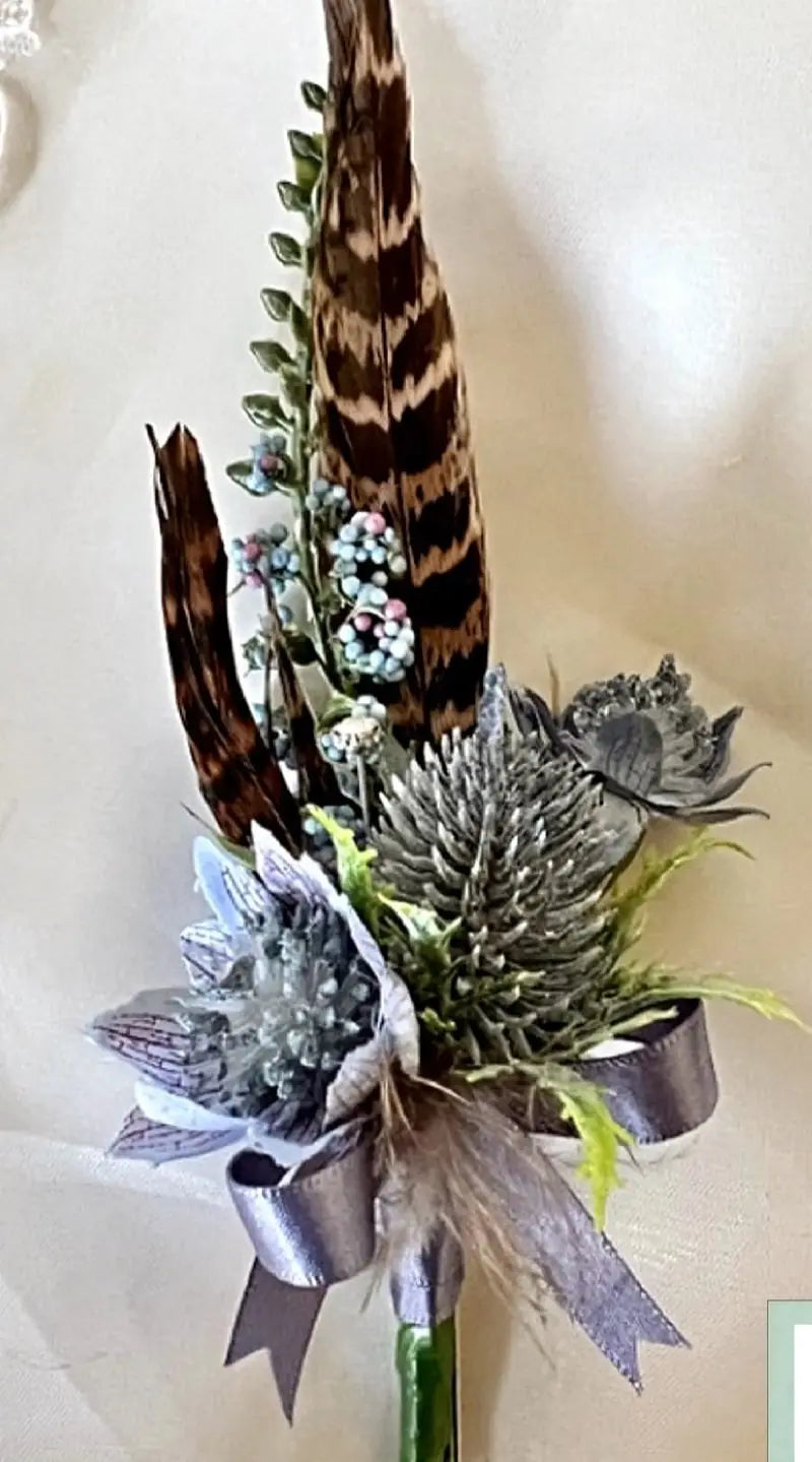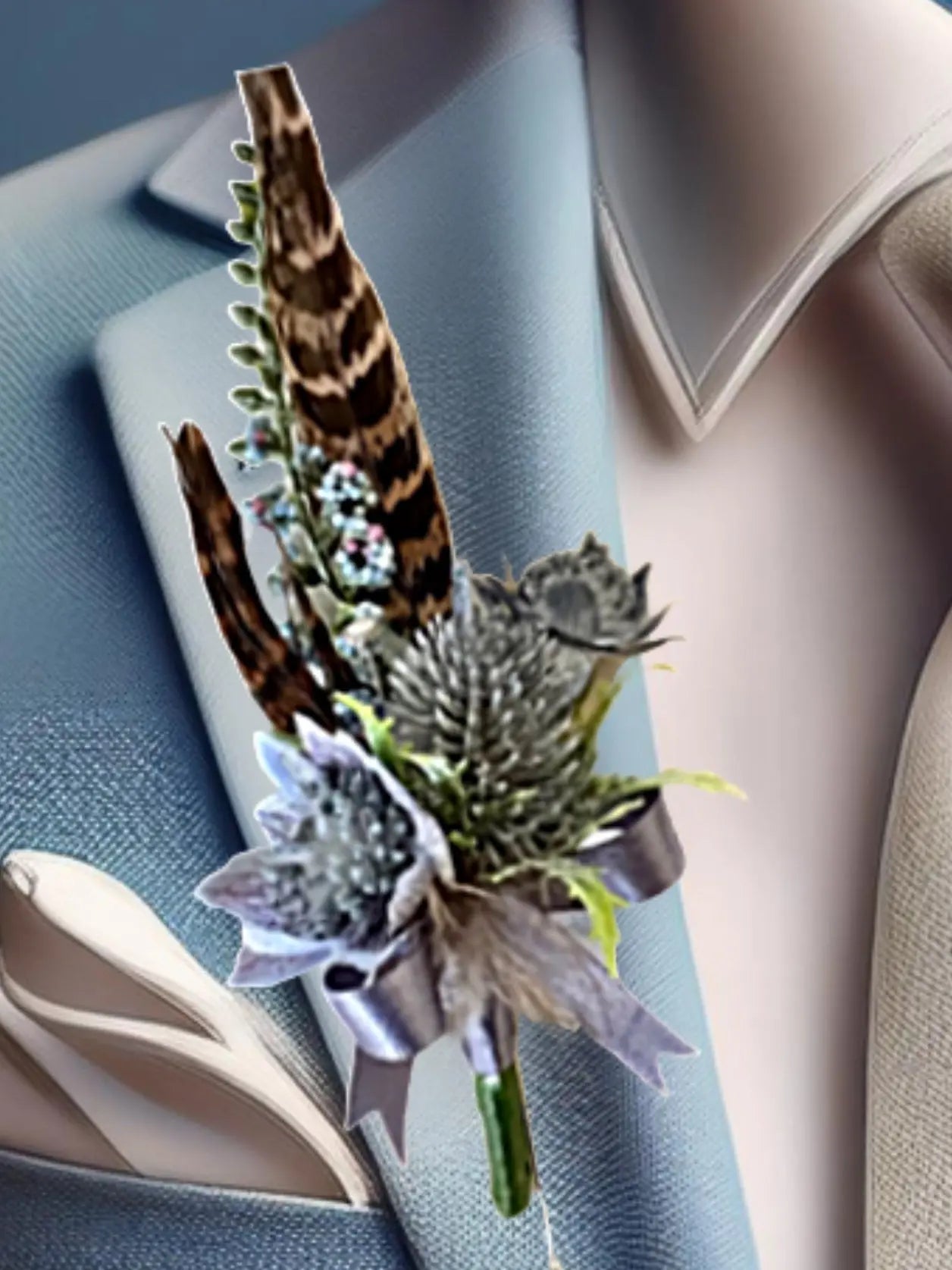 Gents, guest buttonhole Gents, guest buttonhole with Dusty blue eryngium thistle and pheasant feather detail Add a touch of elegance... Read more