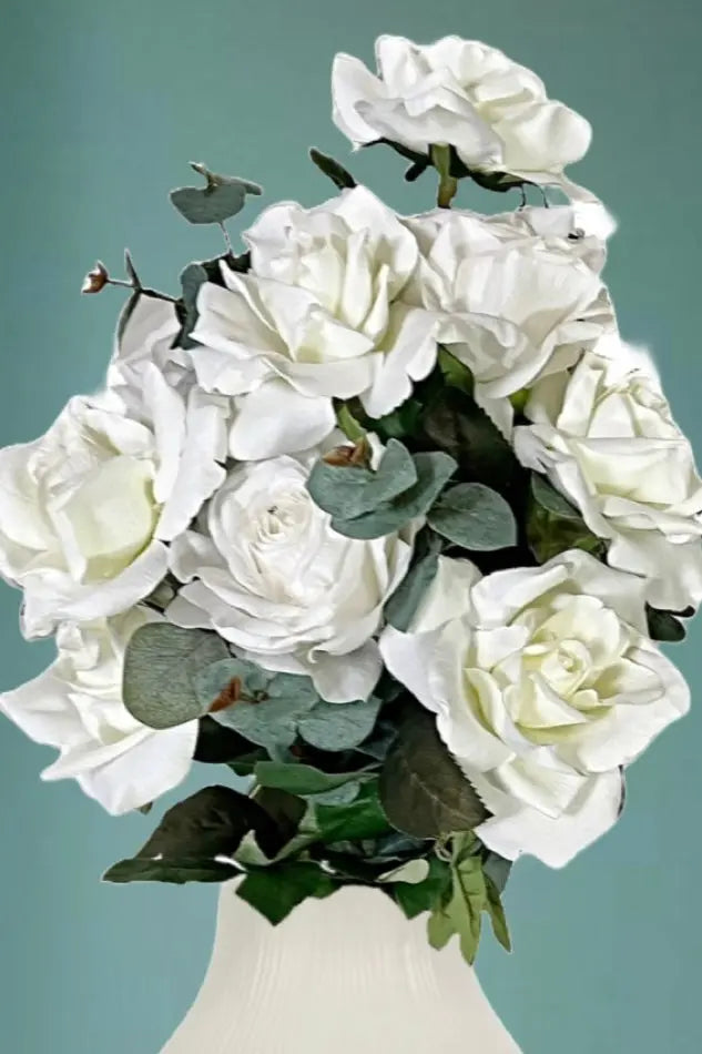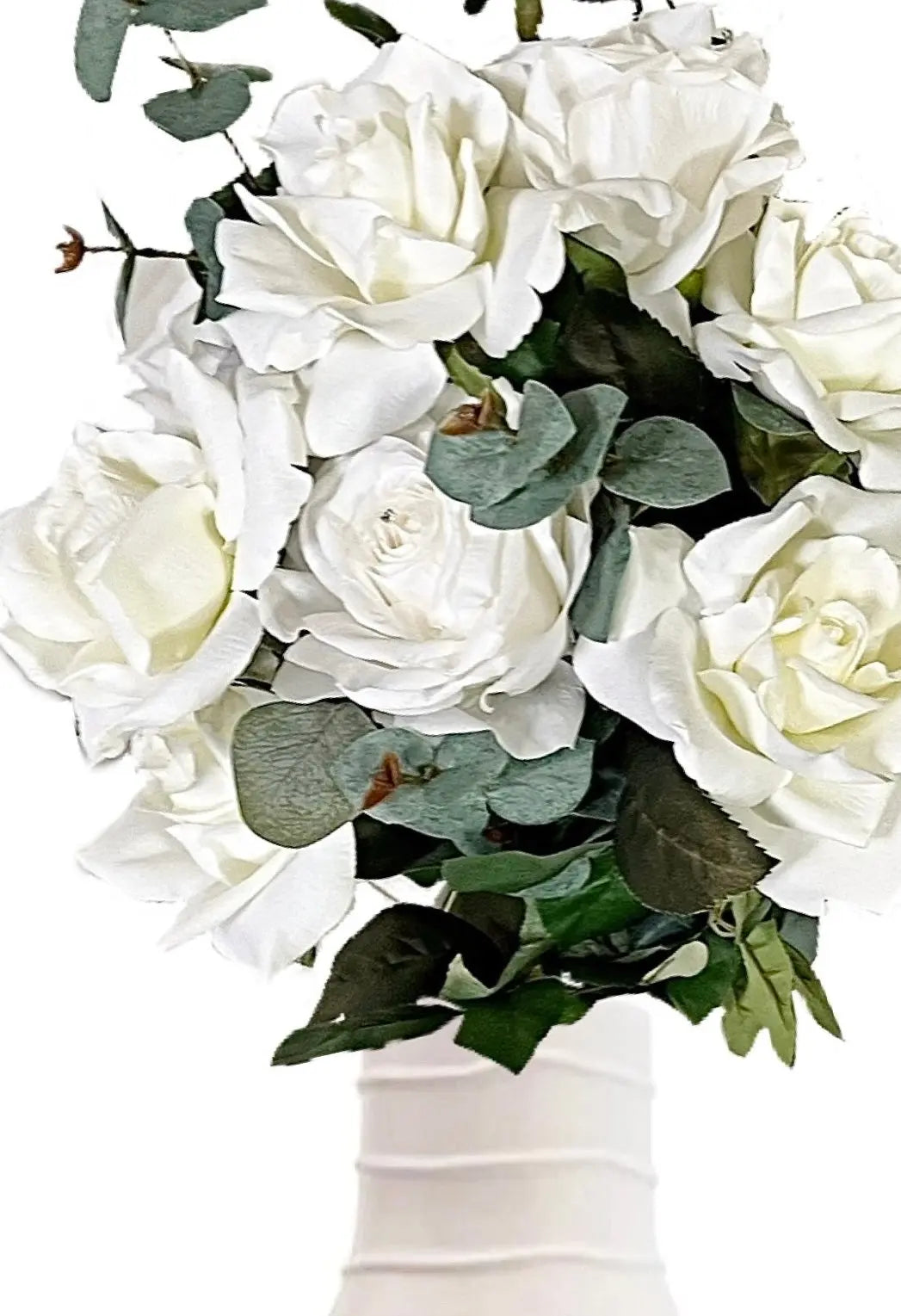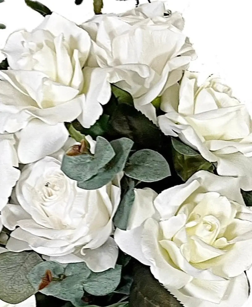 Beautiful very Large Artificial large classical tall open spray arrangement with silk very large english roses in white & ivory with touches of eucalyptus, foliage detail