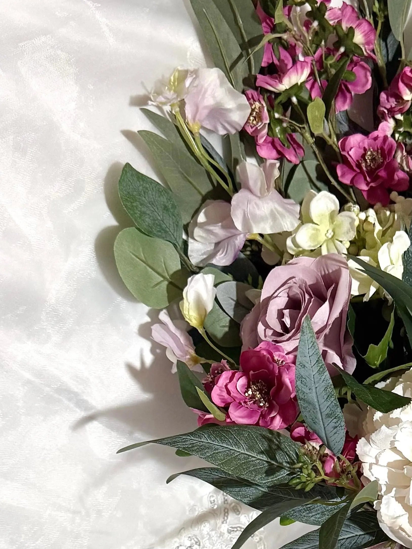 This beautifully curated collection features a cascading bouquet design that seamlessly blends mauve and cerise roses, hydrangea, sweet pea, and wild spray roses, paired with eucalyptus.
