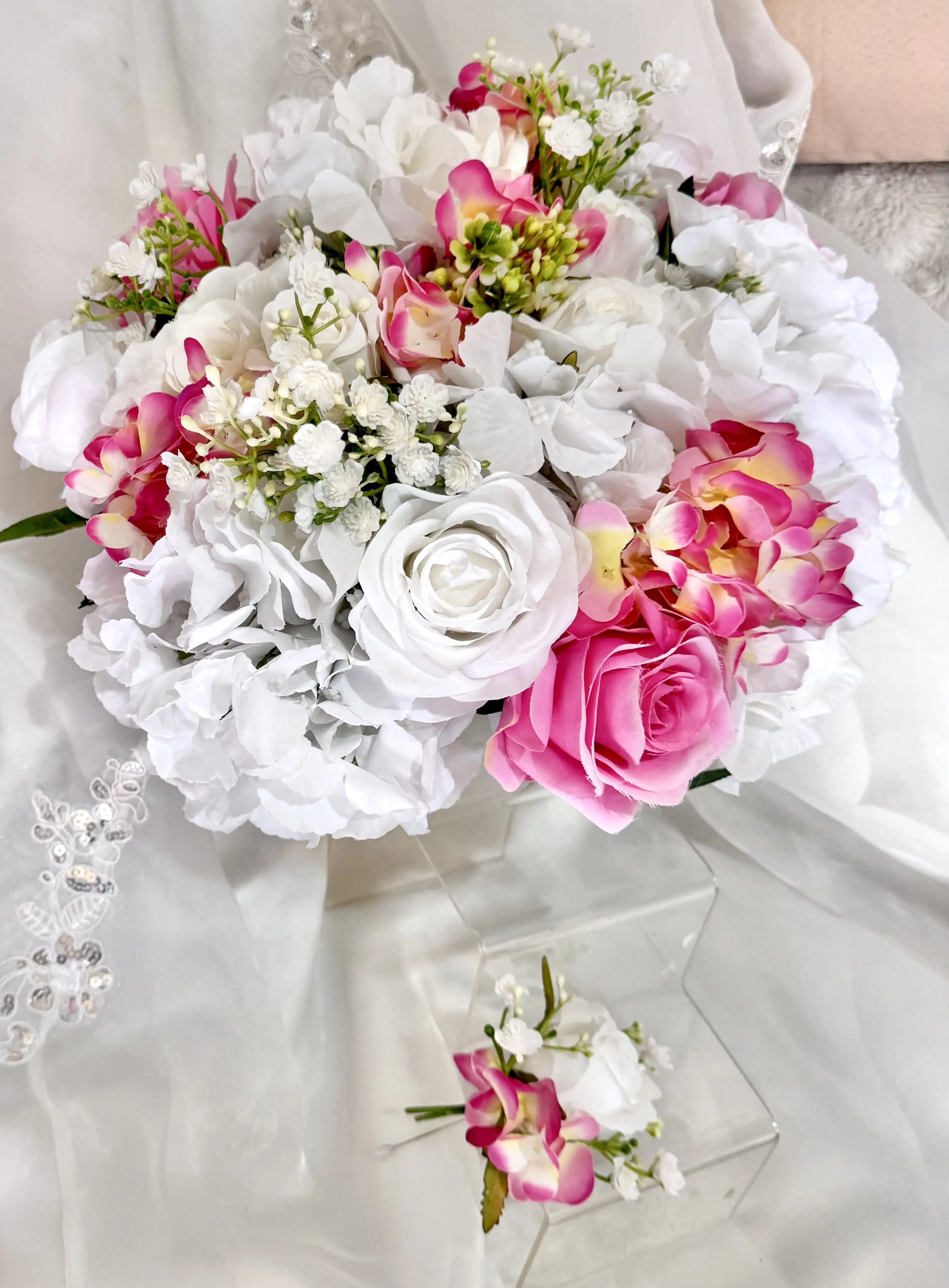 It features a tound design that beautifully interweaves vibrant cerise pink roses and white hydrangea with elevating the elegance of any wedding ceremony. with matching grooms buttonhole