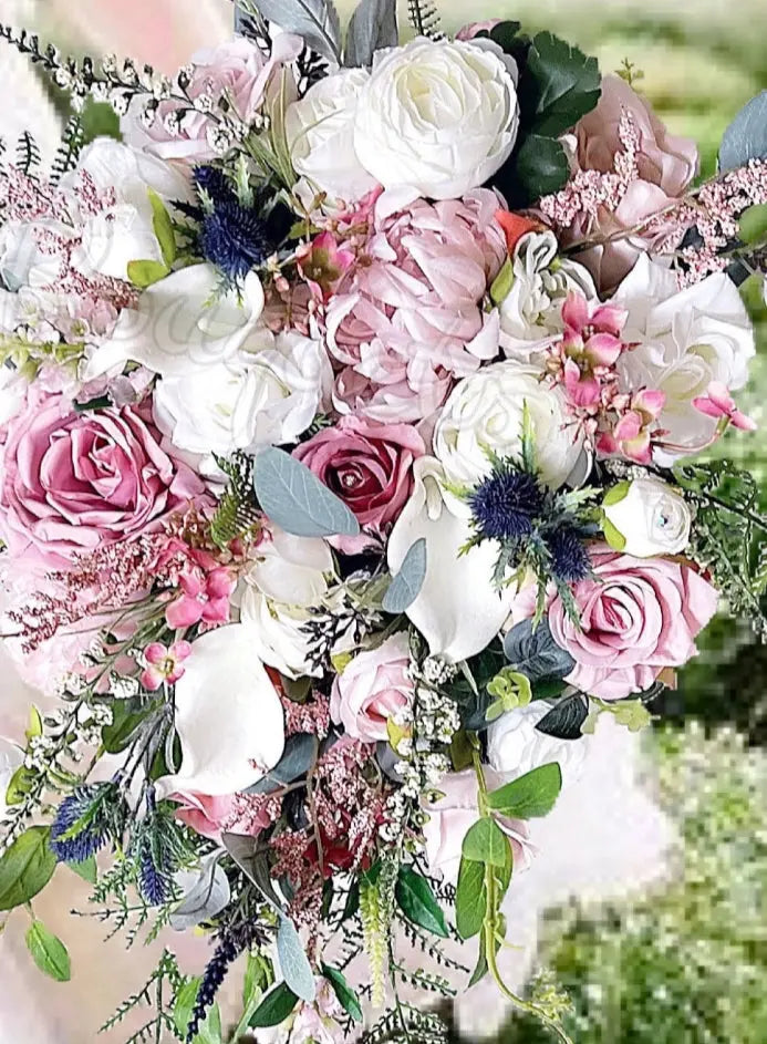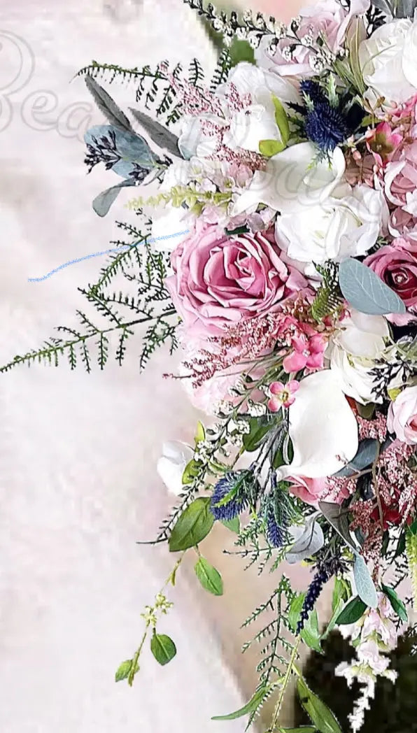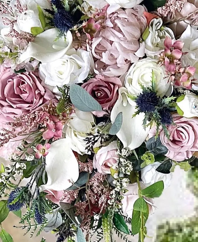 The cascading and waterfall design of these mauve roses and scottish sea holly thistles is sure to make your special day even more memorable.