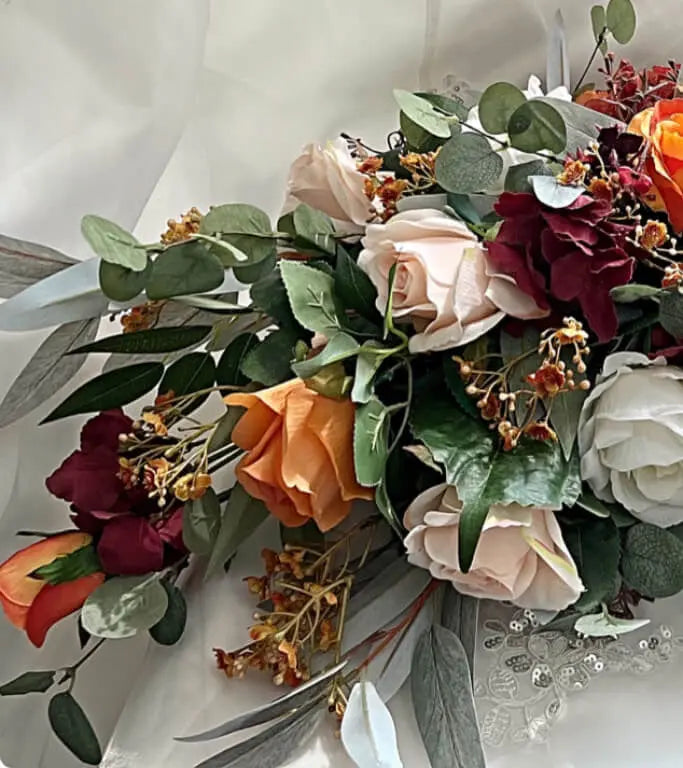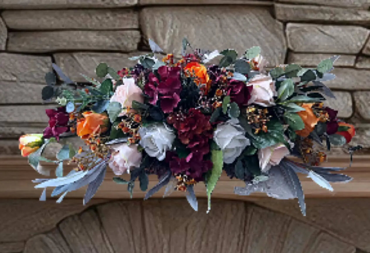 With roses, chrysanthemum in burgundy, burnt orange and creams with Autumnal russet hues