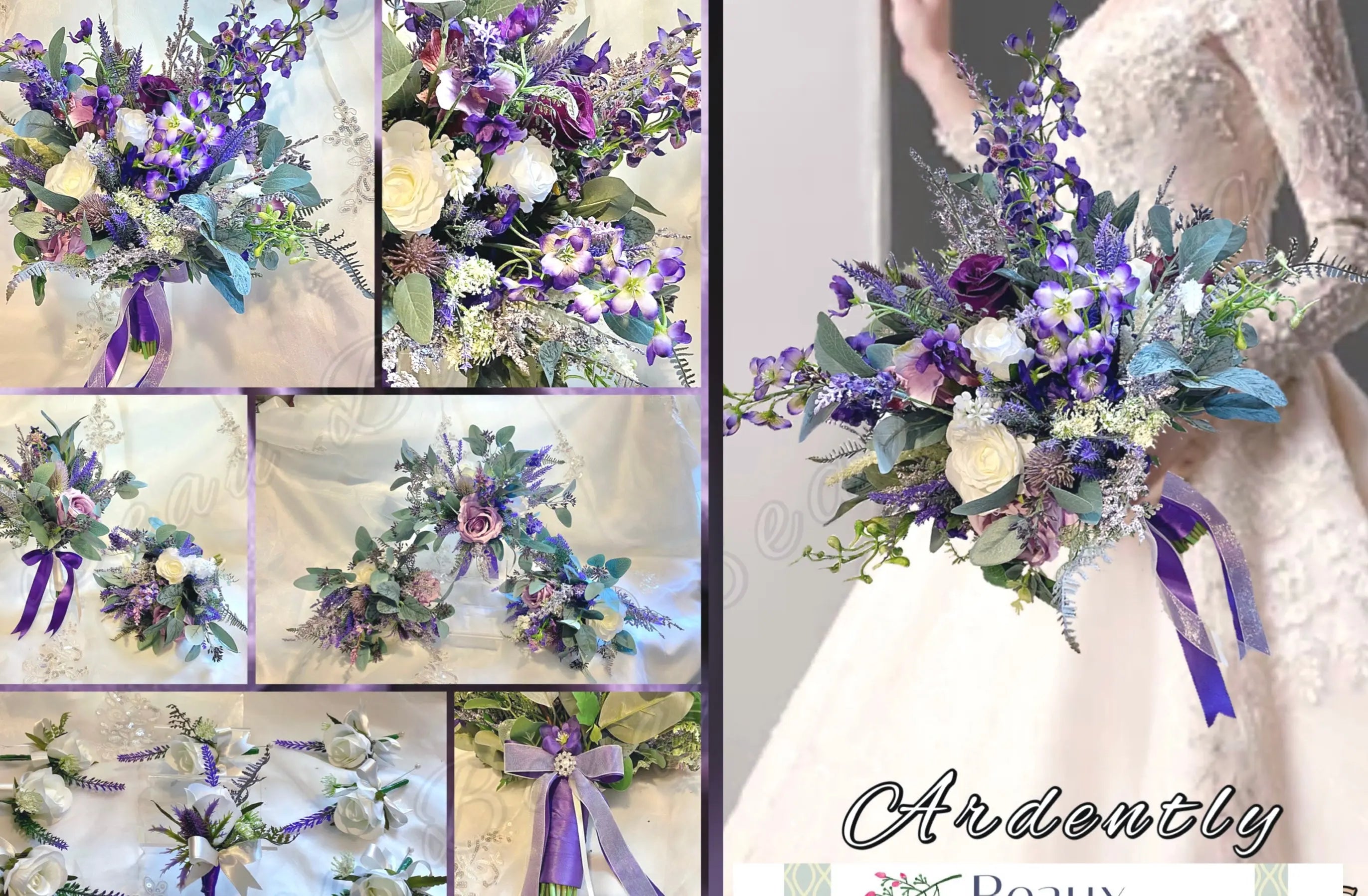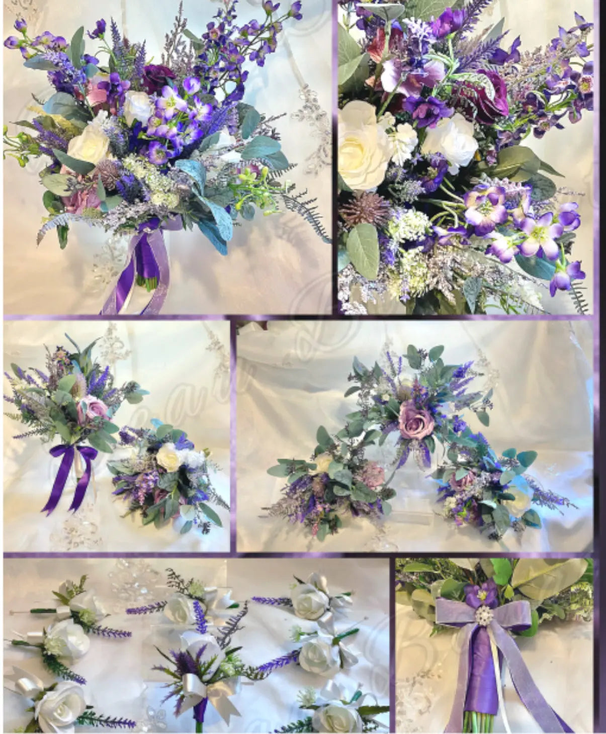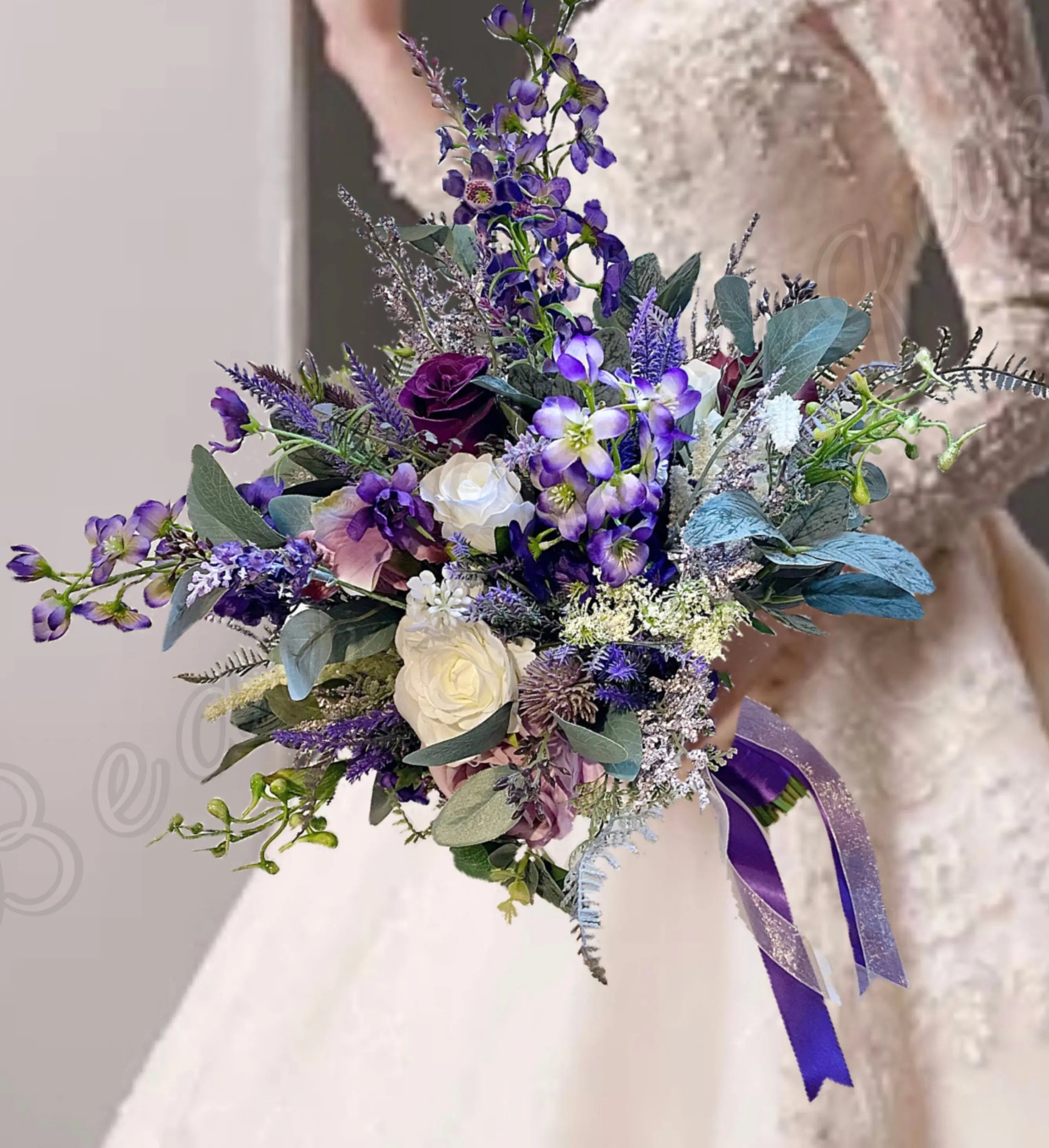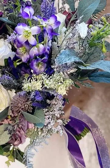The bouquet features artificial ivory and , lilac and purpledelphiniums, Heathers, calla lily, gypsophila, Veronica and eryngium thistle.