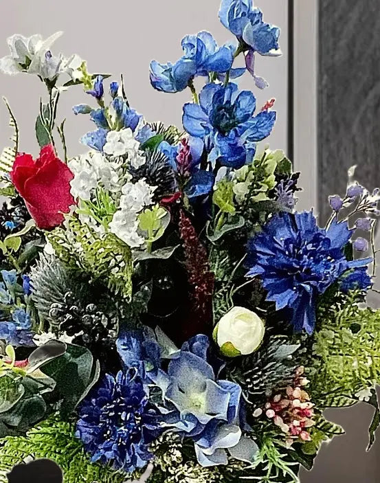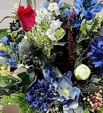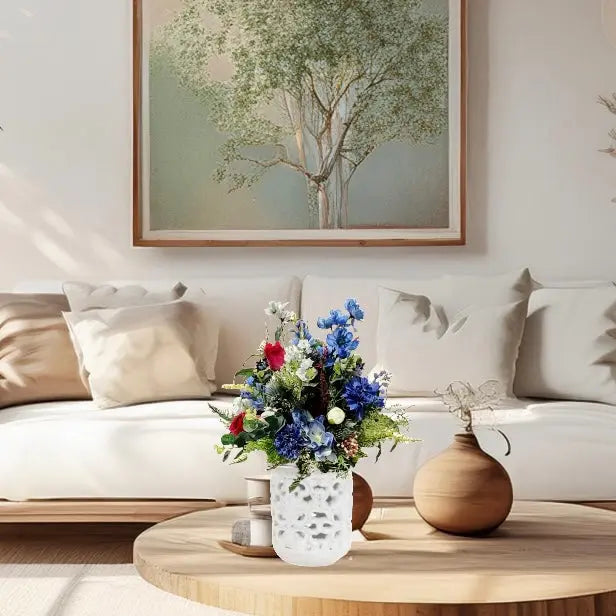 Silk blue Flower Vase Arrangement with White, Red Flowers