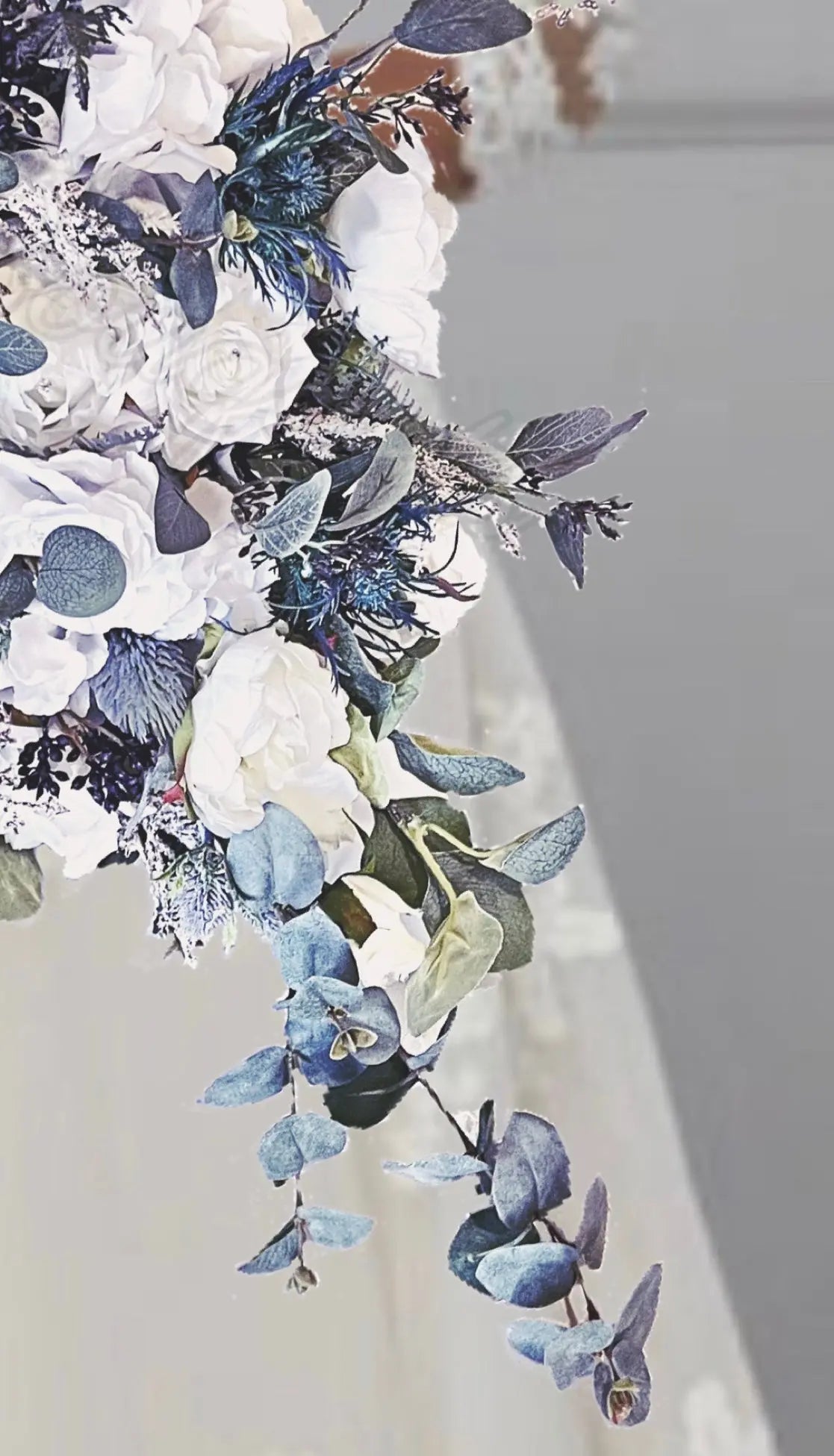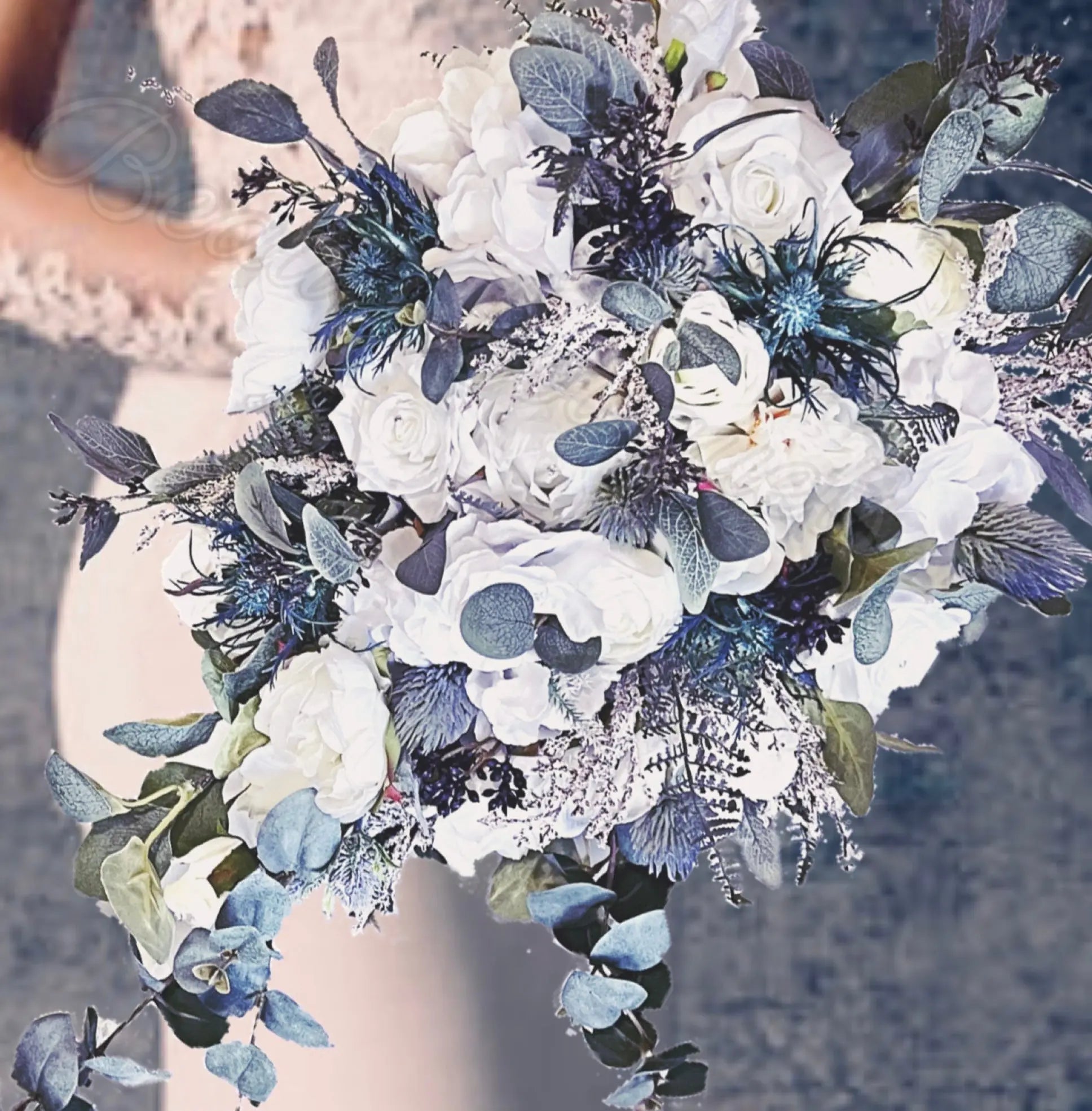 The artificial rose bouquet in blues, white and ivory flowers are beautifully created to produce a stunning and realistic look.