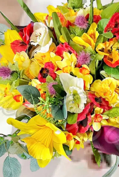 Crafted from artificial Flowers of yellow, red, dark pink , ivory white.