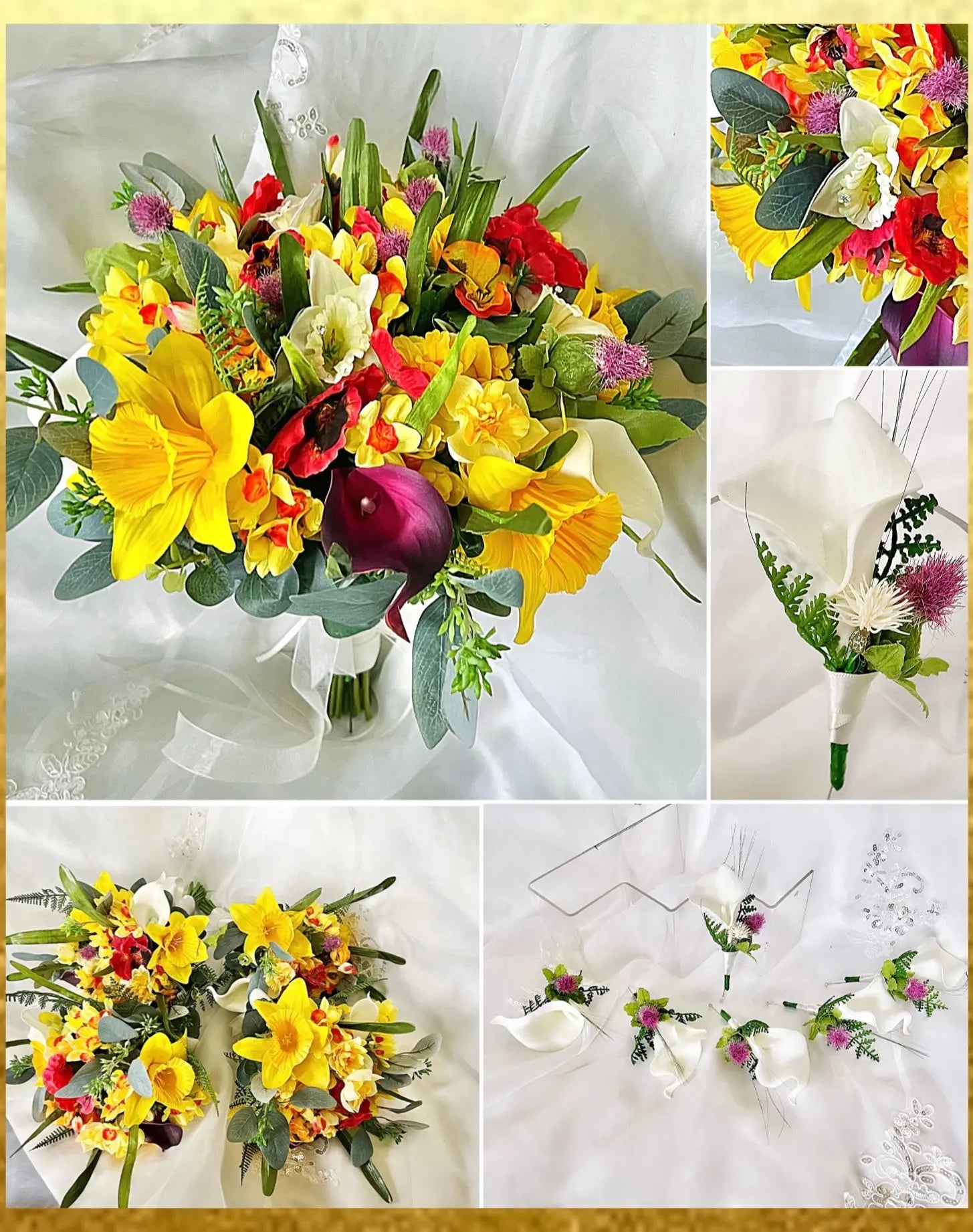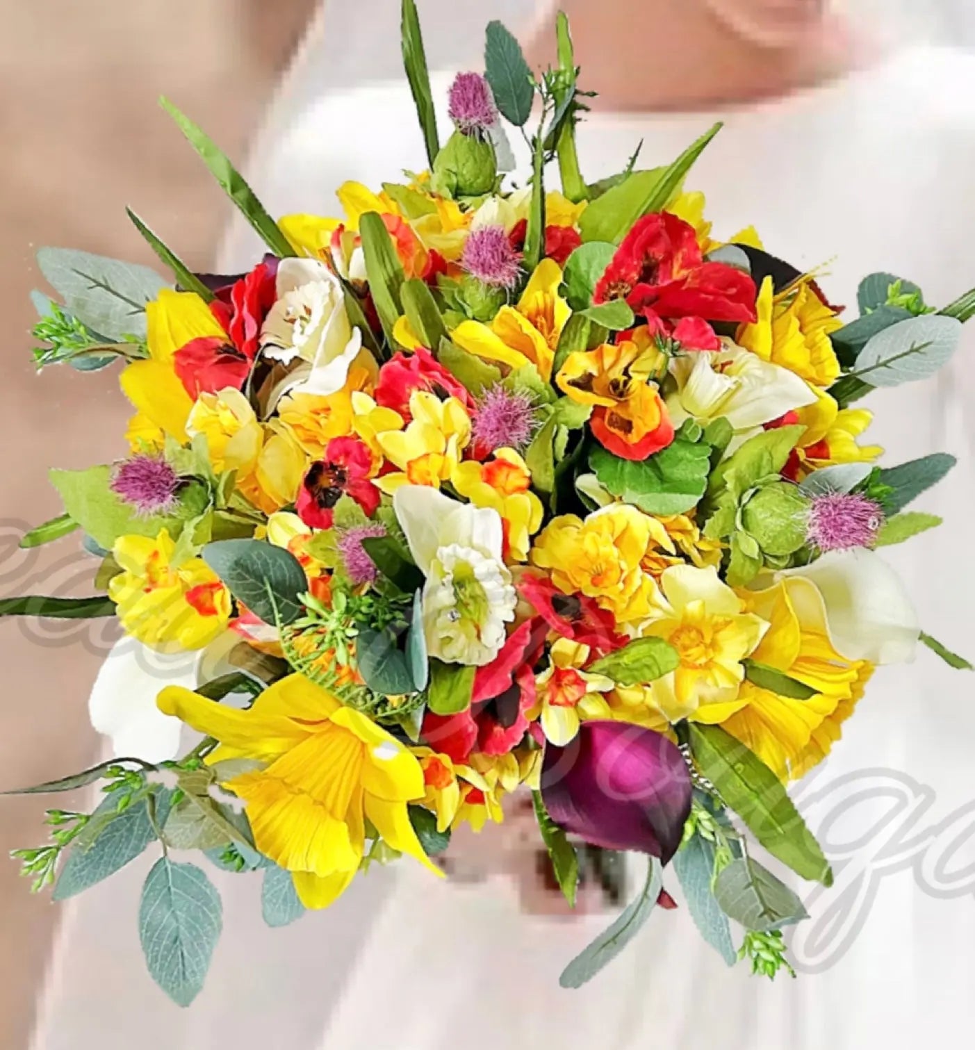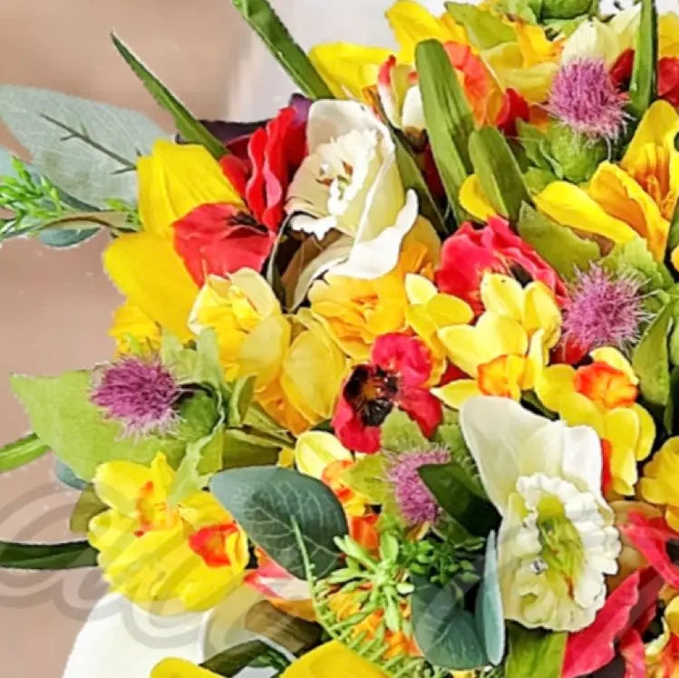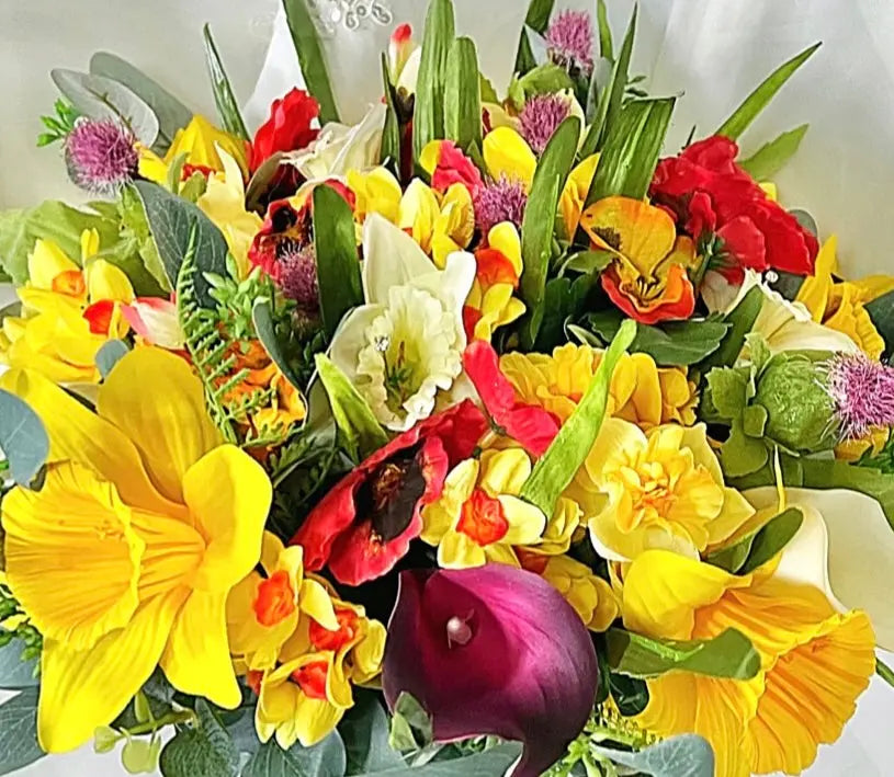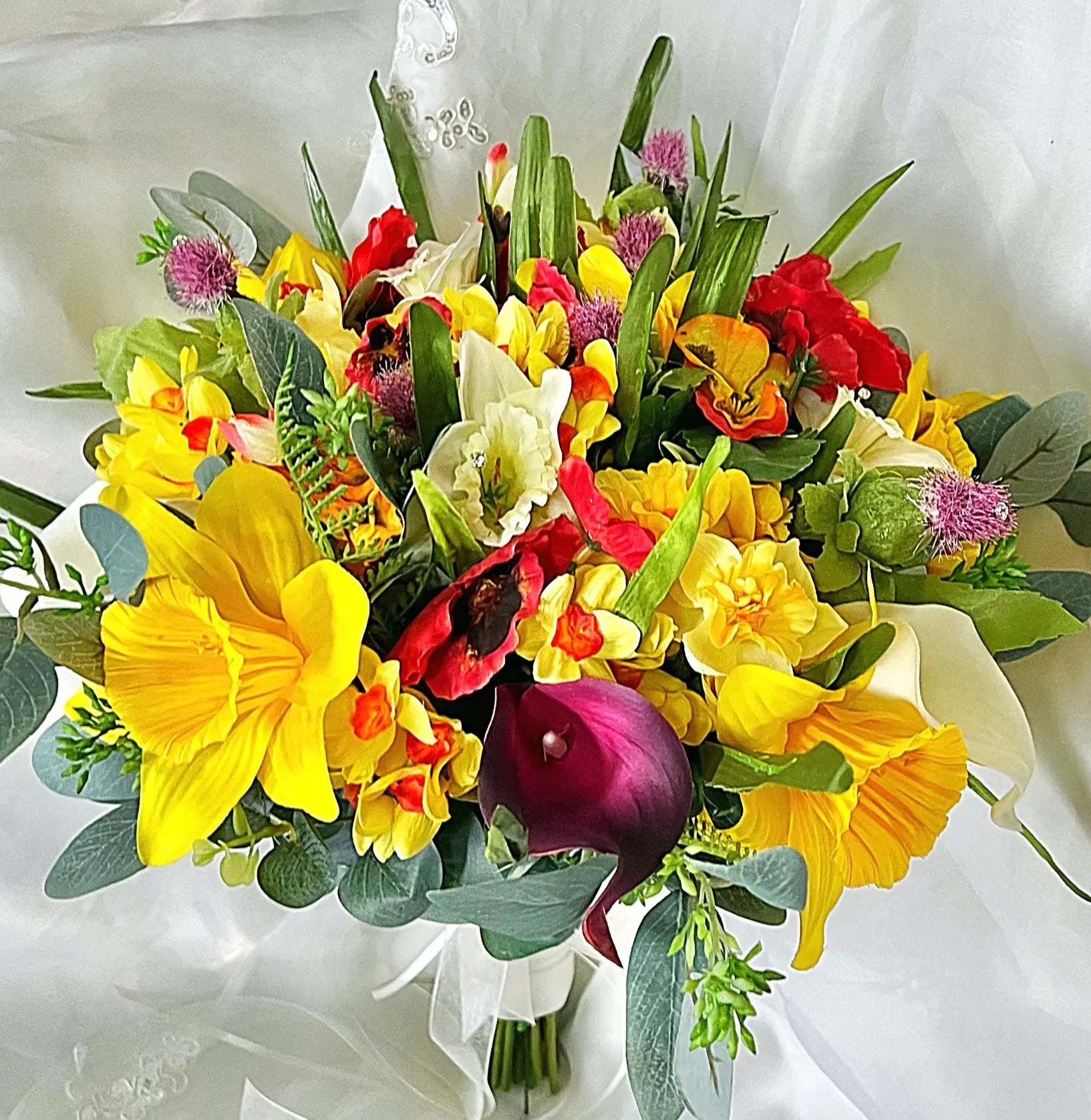This abundant and special round bouquet full of poppies, daffodils, freesia, calla, tulips and wild thistles making it the perfect addition to any wedding or special occasion.