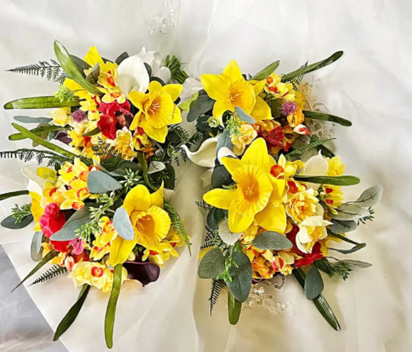 Silk daffodil, poppy bouquet yellow, red, cerise, Ivory round Bridal flowers