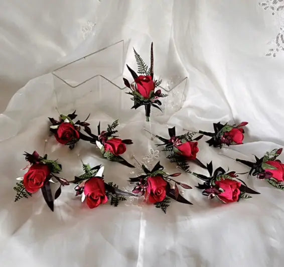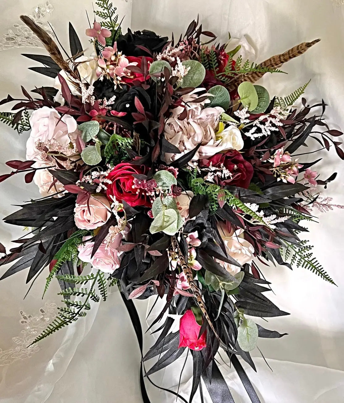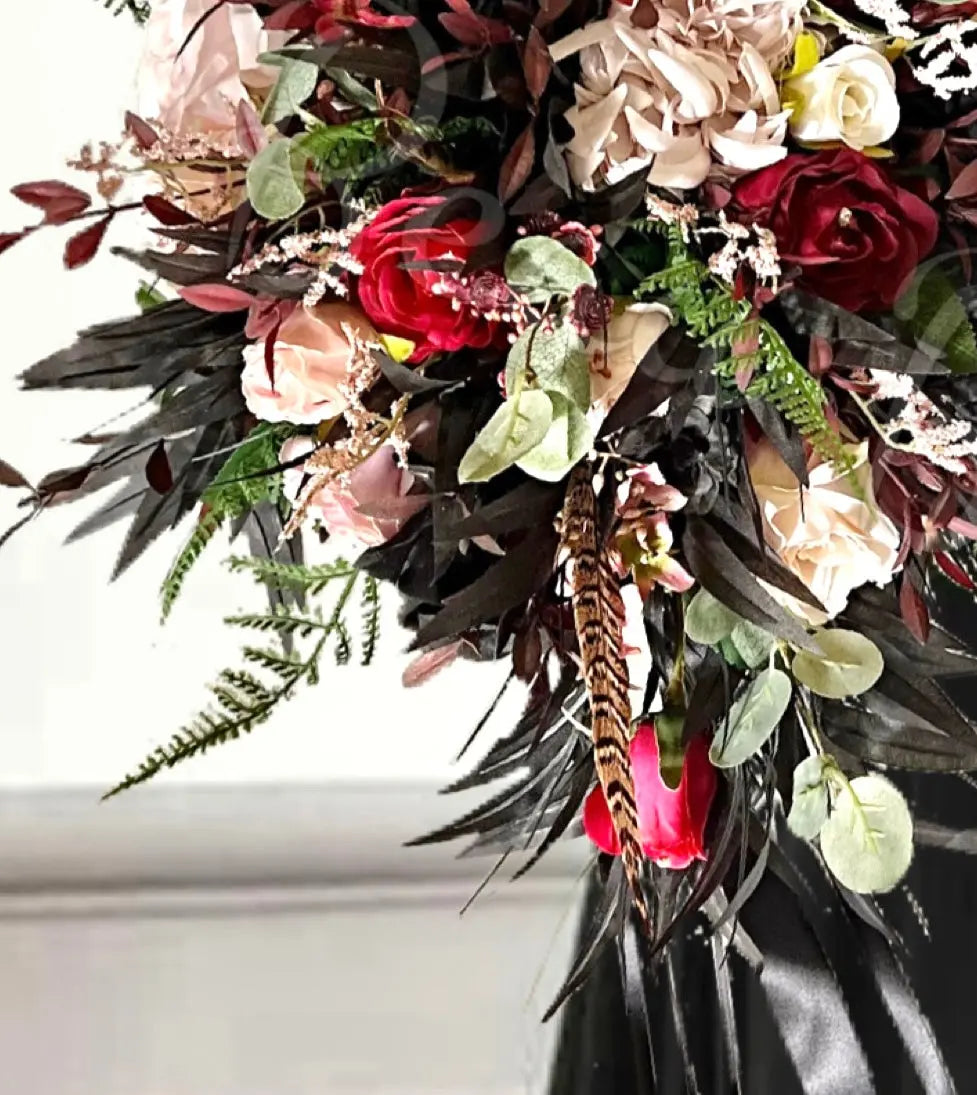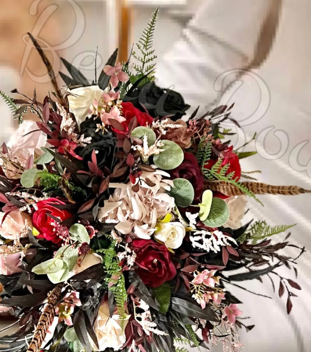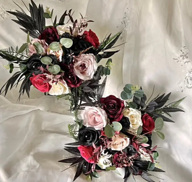 The bouquet features artificial burgundy and dusky pink roses, with black bamboo leaf perfect for adding a classic touch to your special day.