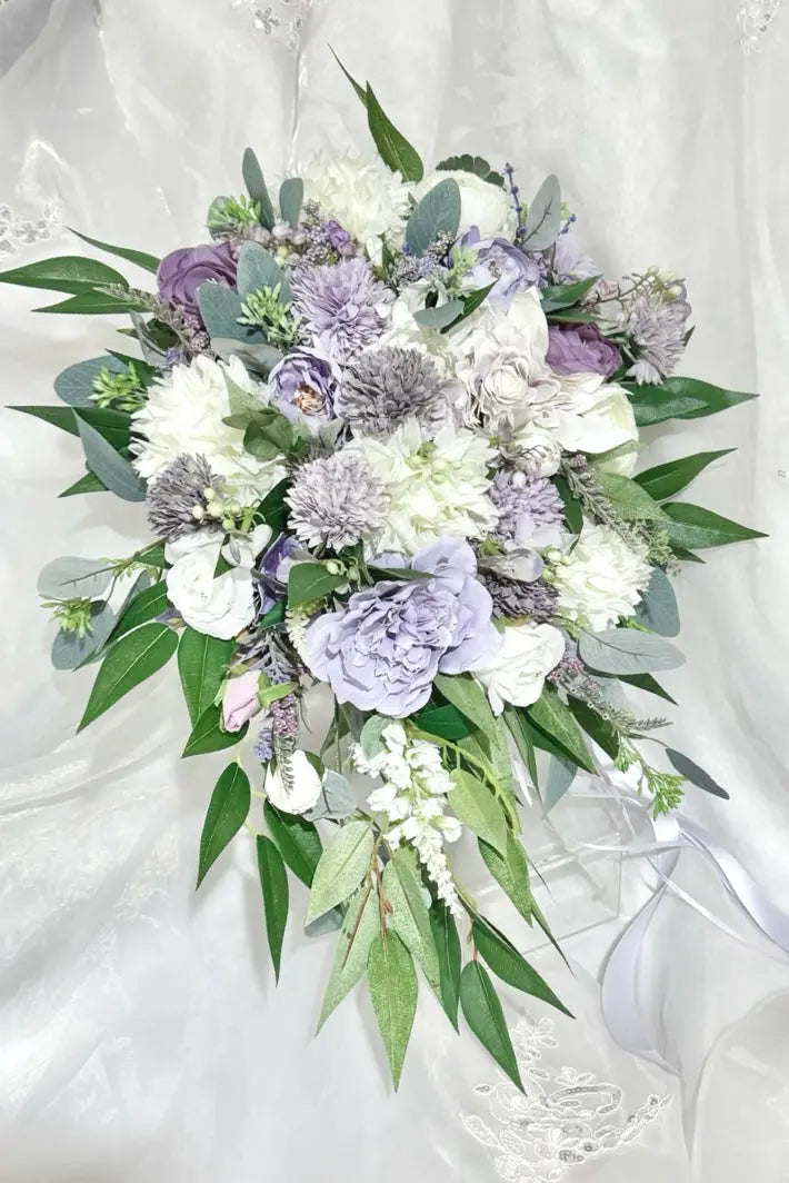 Silk Rose bouquet in mauve, lilac, Ivory teardrop Bridal flowers