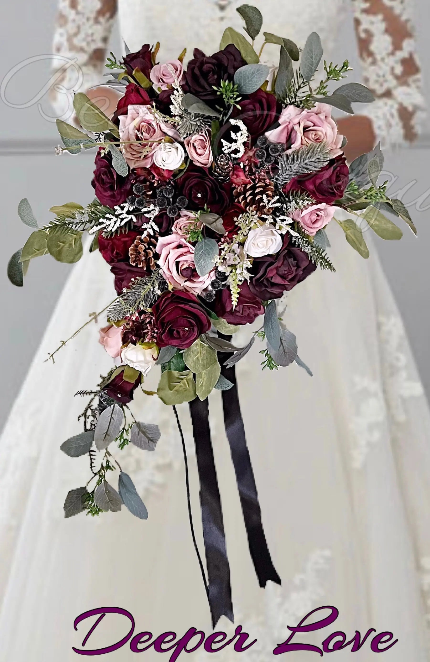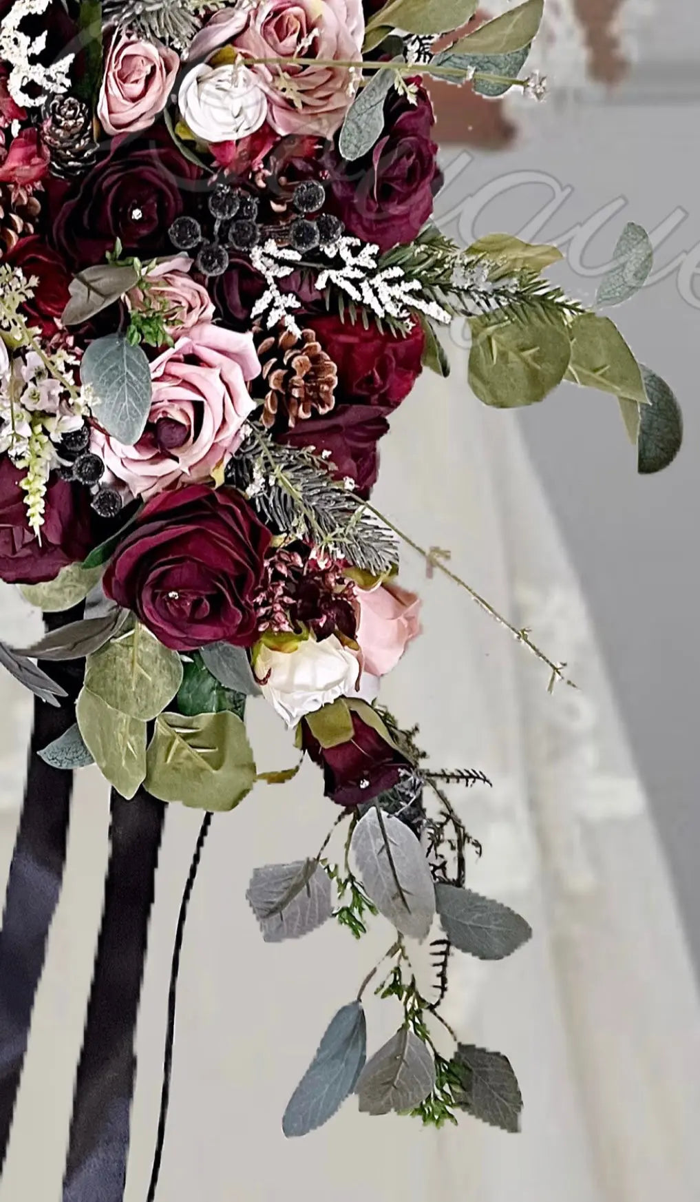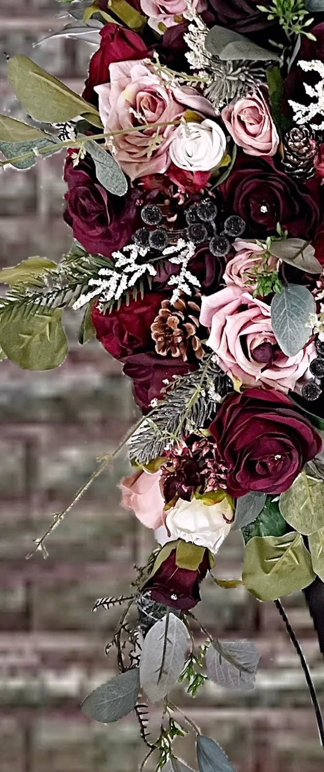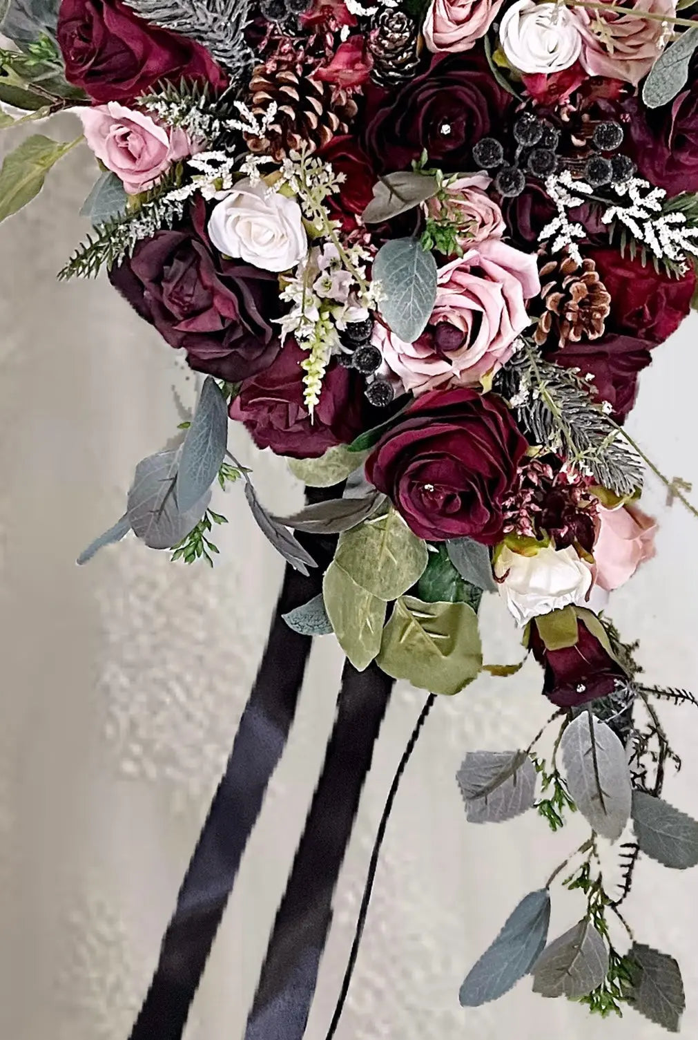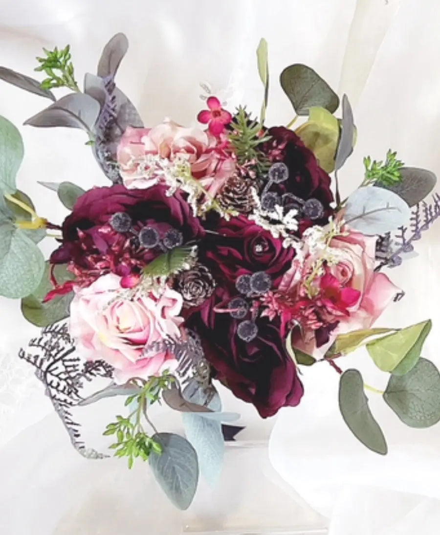 The bouquet features artificial burgundy, red, black & blush roses, with eucalyptus foliage perfect for adding a classic touch to your special day.