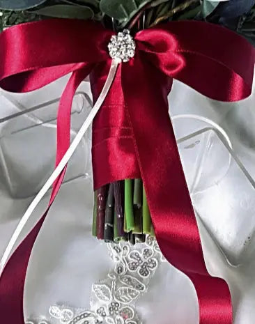 The bouquet features artificial burgundy and red roses, perfect for adding a touch of winter / Christmas to your special day. Measuring 20 inches in size, this bouquet is sure to make a statement wherever you choose to display it.
