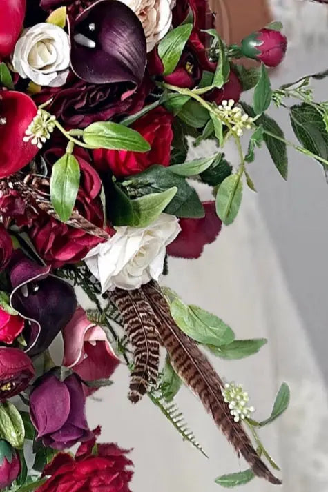 Silk Rose, Calla Cascading Bridal Bouquet Wedding Flowers in Burgundy, Ivory