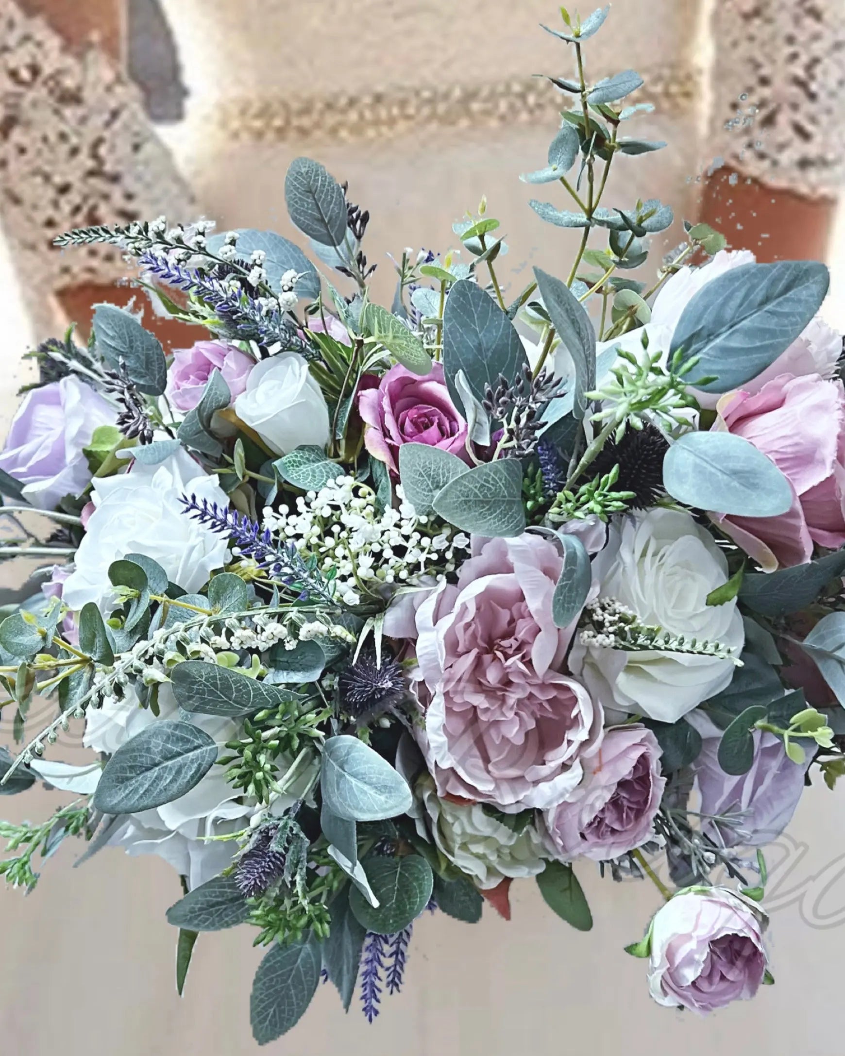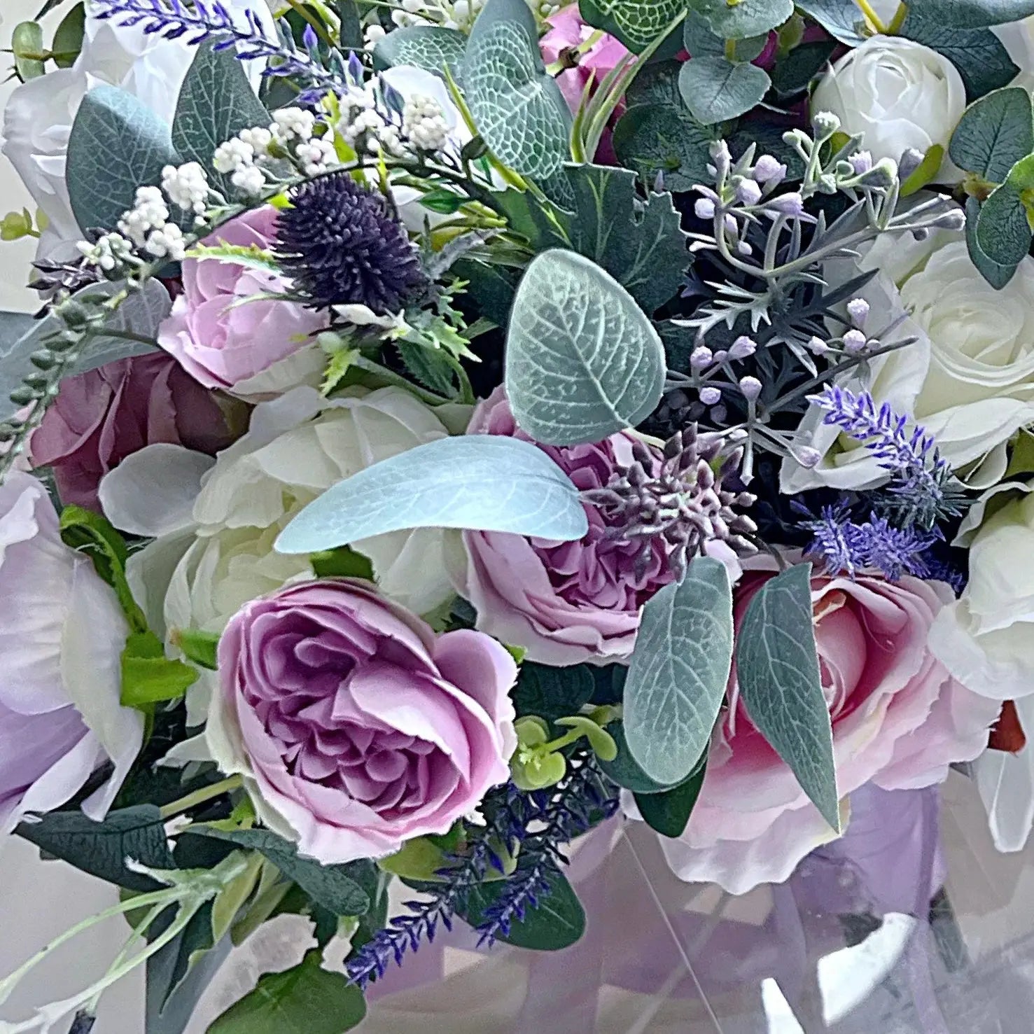 Crafted with exquisite artificial lilac, mauve, plum purple, white, and ivory flowers, it radiates a rich, abundant, and lifelike appeal.