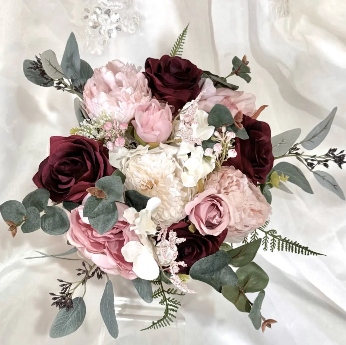 The bouquet features artificial burgundy and dusky pink roses, perfect for adding a classic touch to your special day.