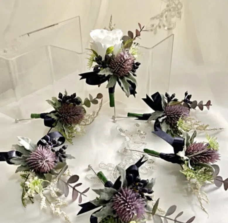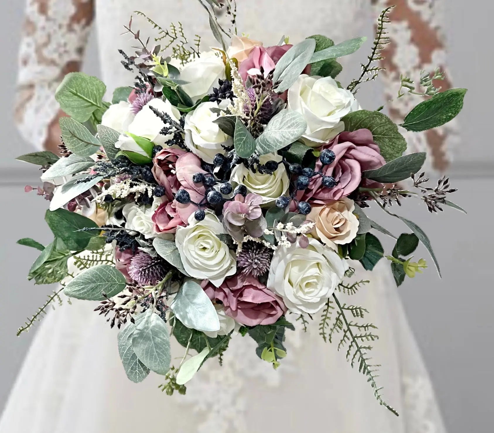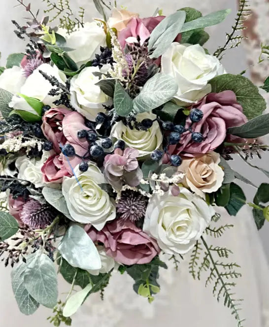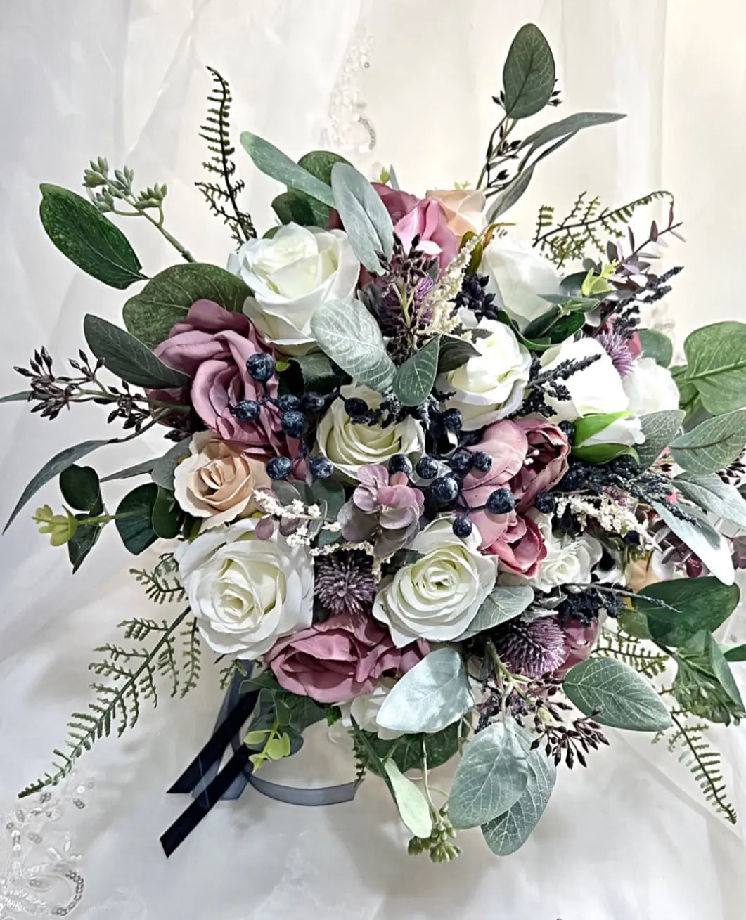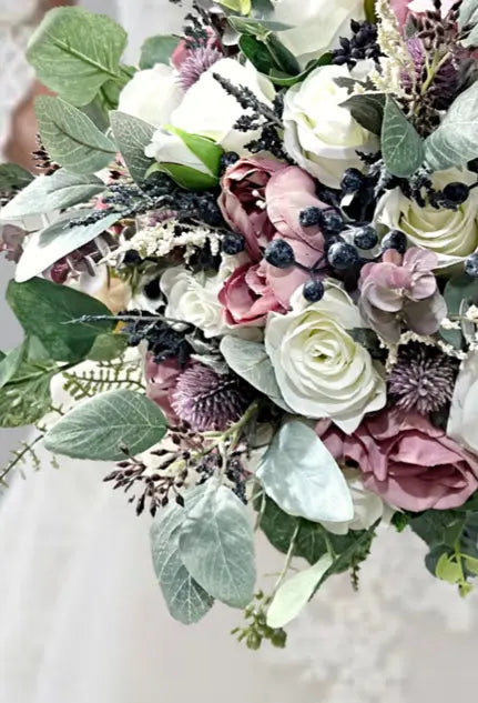 The bouquet features a variety of flowers including roses, dark blue thistles and mauve flowers, all of which are carefully crafted to create a beautiful and realistic look.